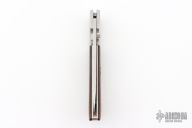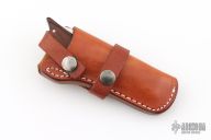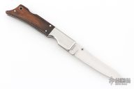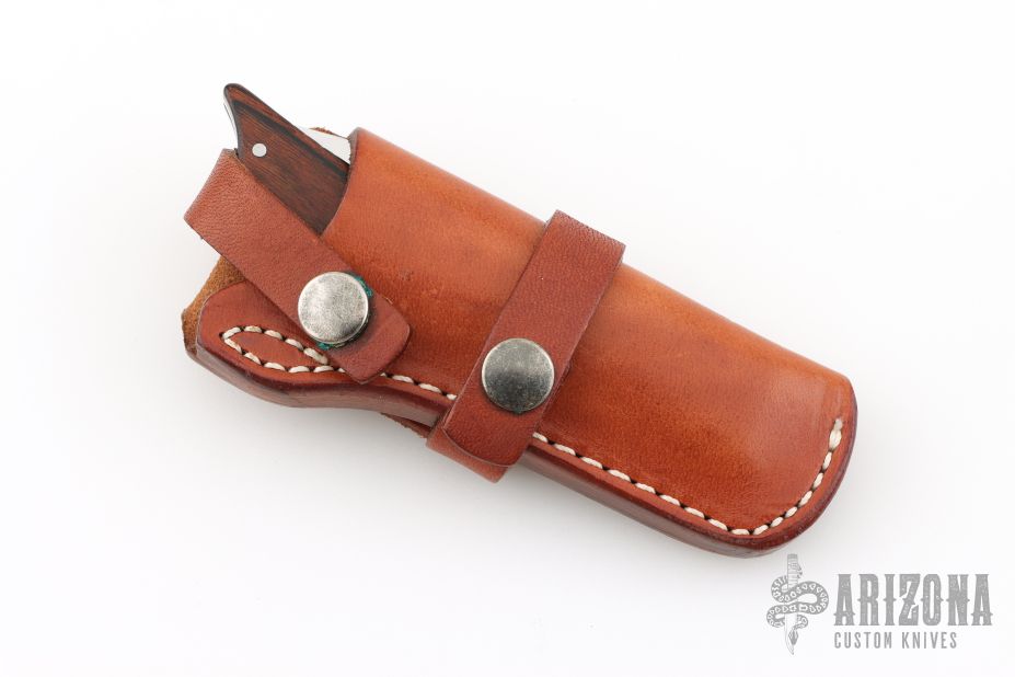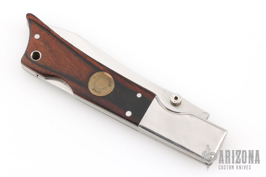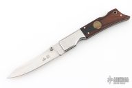 This Gunstock 1 from Al Mar Knives features a drop point satin finish blade with thumbstud. The handle is comprised of stainless steel bolsters and titanwood scales with faux bullet casing over stainless liners and lockbar. Lanyard tube in pommel. Comes with a small leather belt sheath designed to look like a holster. Has scratches, has been used and carries, good user condition. #105/200