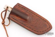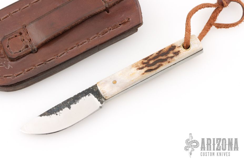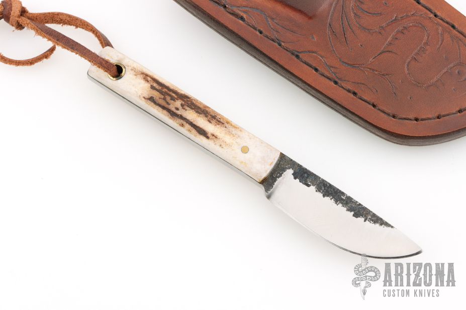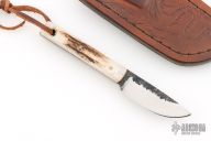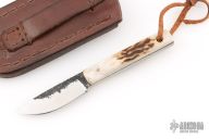 This Knife by ML Knives features a forge finished blade with satin bevels, .196" blade stock and .722" blade depth, full tang construction. The handle has stag scales and lanyard thong. Comes with a brown leather sheath. The listing also includes the maker's card and COA. Excellent condition. The COA states the spring steel came from a 41 Dodge DeSoto.