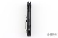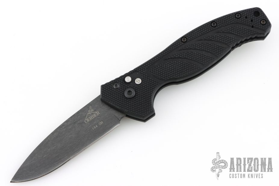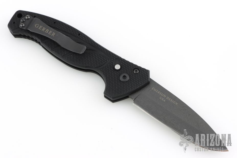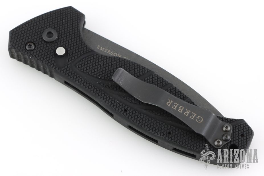 This Gerber Emerson Alliance tactical knife has a black drop point blade. Handle is black anodized aluminum with milled scales and notched thumb rest, safety button, lanyard hole, and black stainless steel tip up clip. Excellent condition. This was the first auto that Gerber ever made. Comes with a nylon sheath.