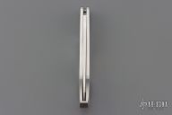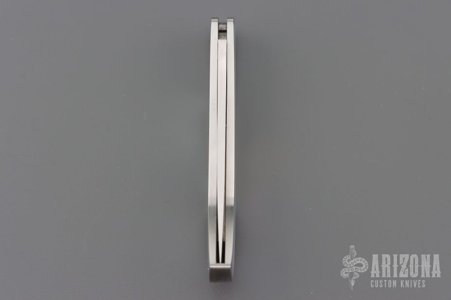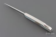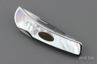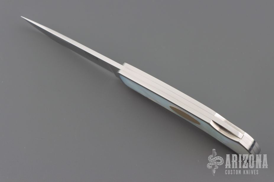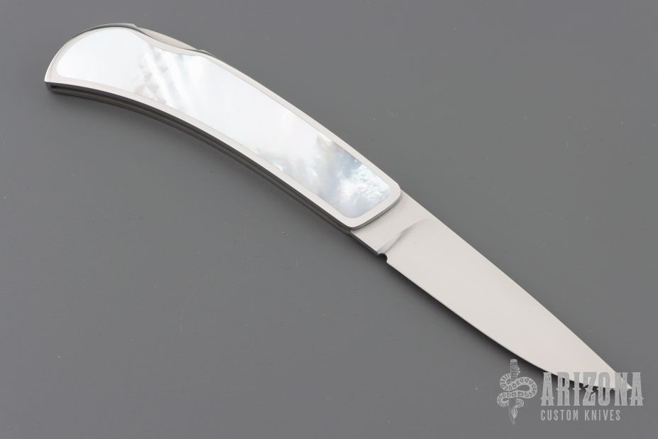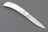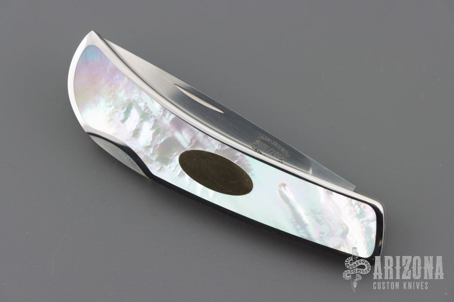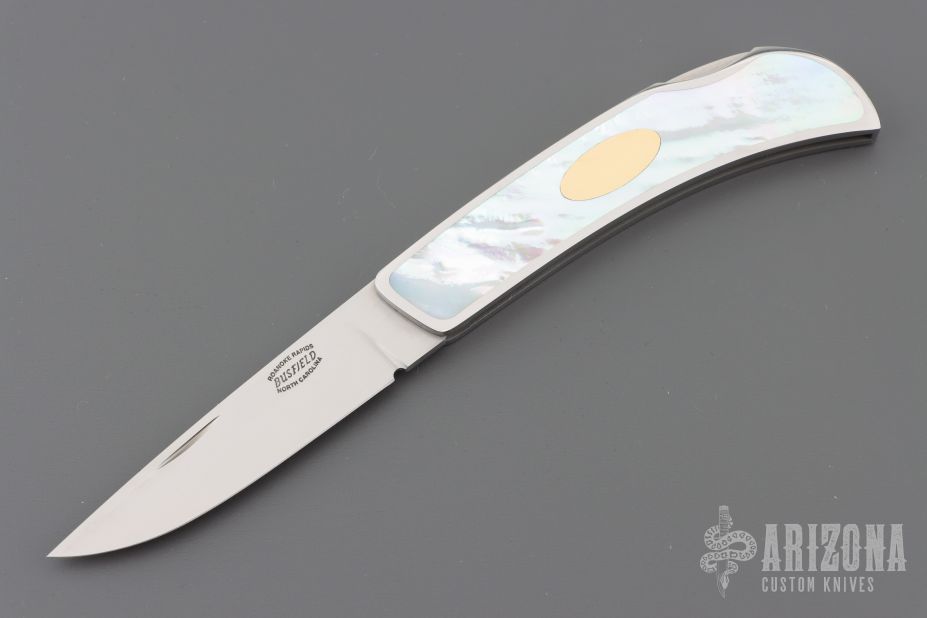 This Interframe lockback folder from Jack Busfield features a hand rub satin finished blade with nail nick. The handle is comprised of a mirror finished stainless steel frame with mother of pearl inlays that have a gold escutcheon inlay, and stainless steel lock spring. Excellent condition. Includes zippered case.