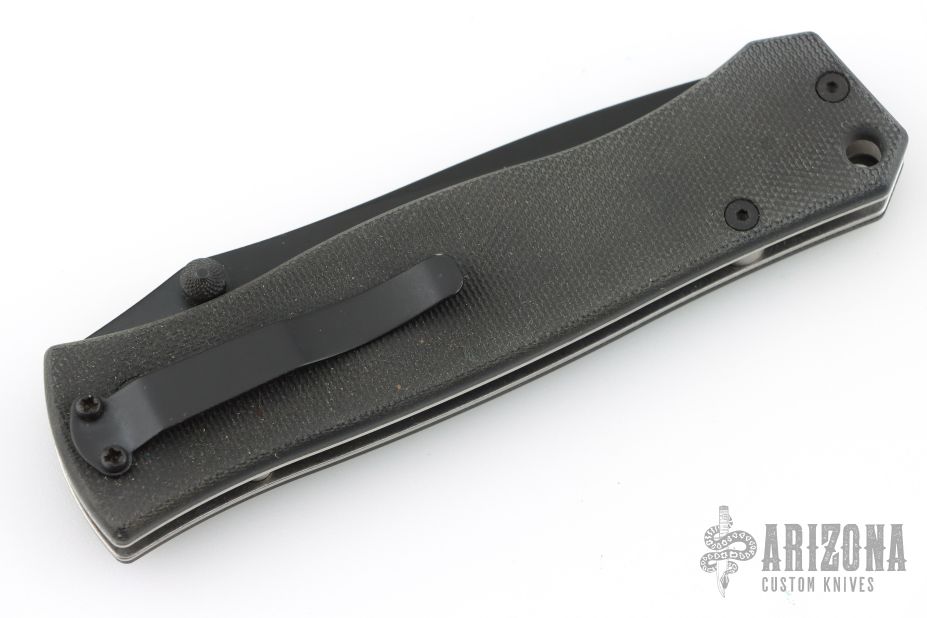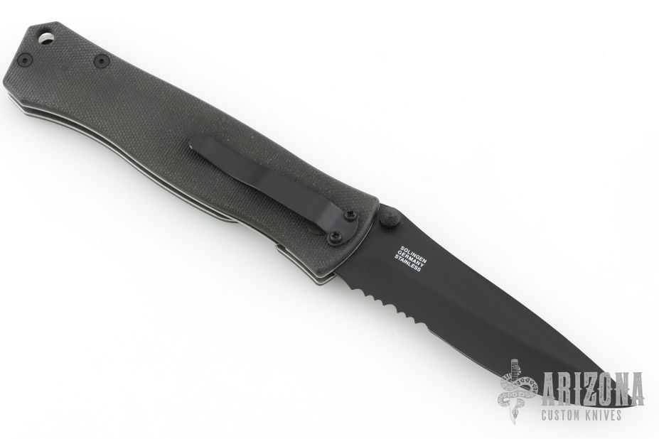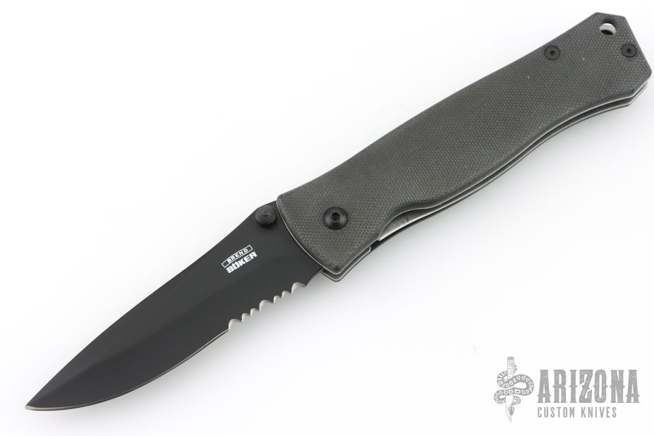 This is a Boker/Brend collaboration is Discontinued. The blade is black with a partially serrated edge. Dual knurled thumbstuds. Textured black G10 scales, stainless liners and black tip down stainless clip. Nice detent, lockup and seating. Very rare and hard to find knife. Has a few light scuffs and scratches, Excellent condition otherwise.