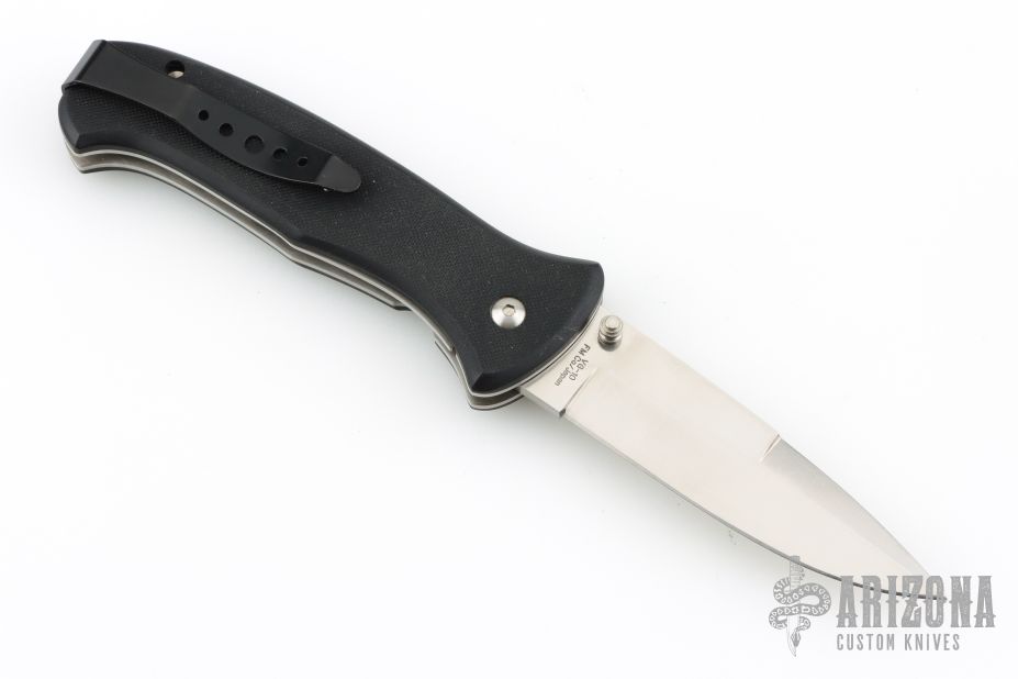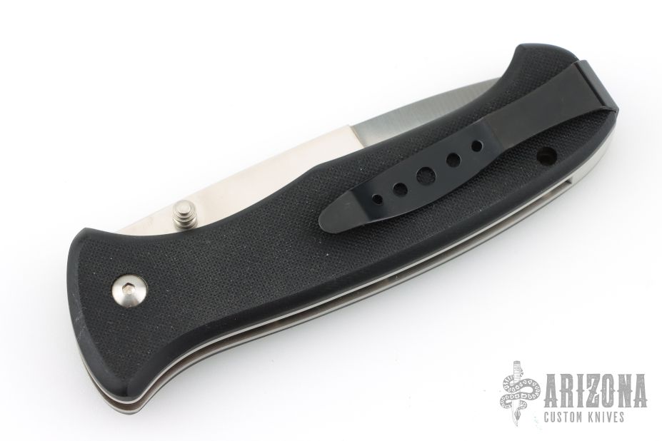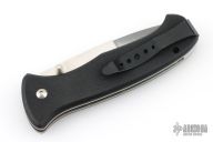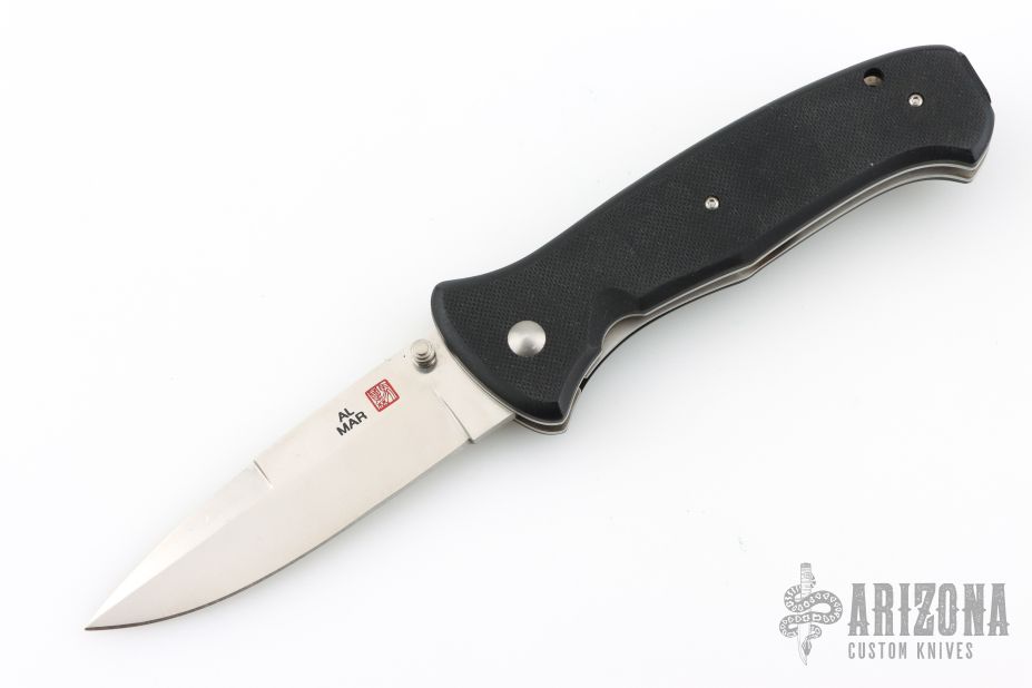 This SERE 2000 Linerlock Folder from Al Mar Knives has a satin finished VG-10 stainless steel drop/ spear point blade with dual thumb studs. Handle is black G10 over stainless steel liners, black stainless steel tip up clip, and lanyard hole. Excellent condition.