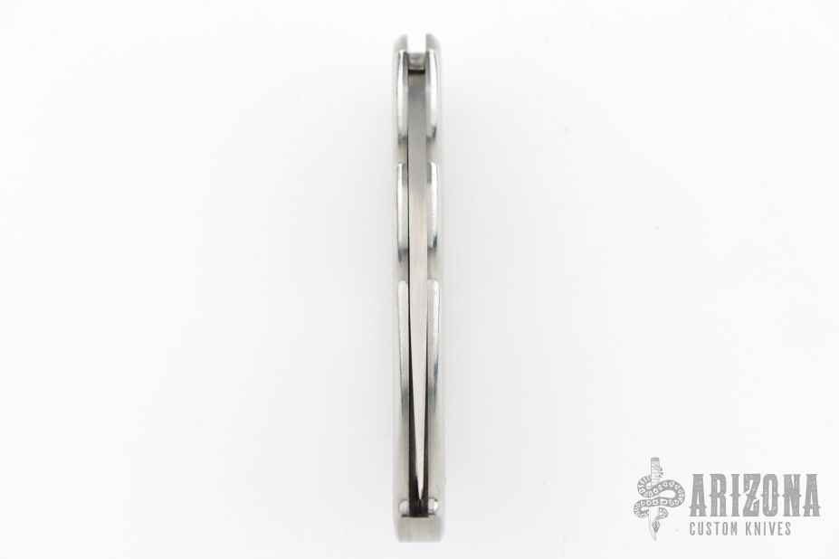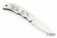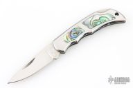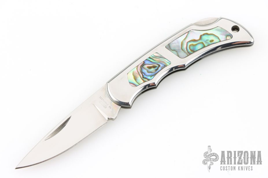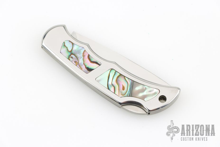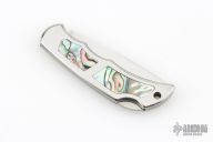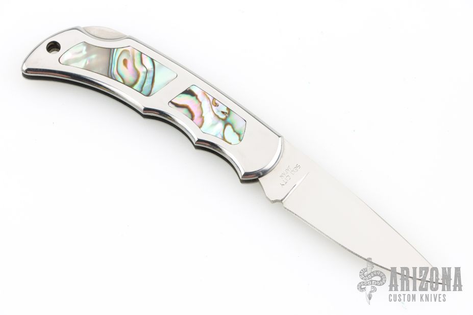 This Interframe Lockback by Hiro features a mirror polished blade with nail nick. The handle has a stainless steel frame with abalone inlays. Has some light scratches, otherwise excellent condition.