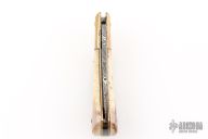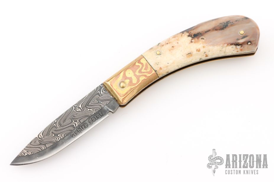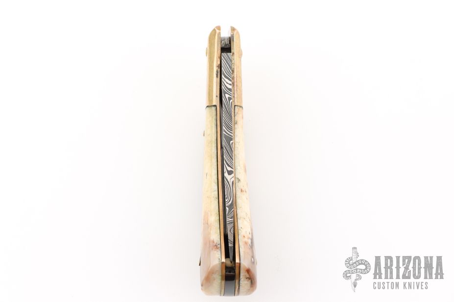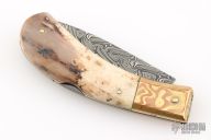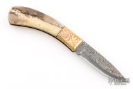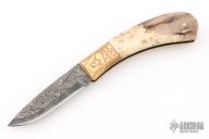 This Lockback by Hugh Bartrug has a three-bar Damascus blade, the third bar on the blade edge is also Damascus but it isn't etched with contrast, instead it is dark blued. The handle has two-alloy mokume bolsters, fossil walrus ivory scales with brass pins, brass liners, and a blued steel backspacer. Excellent condition.