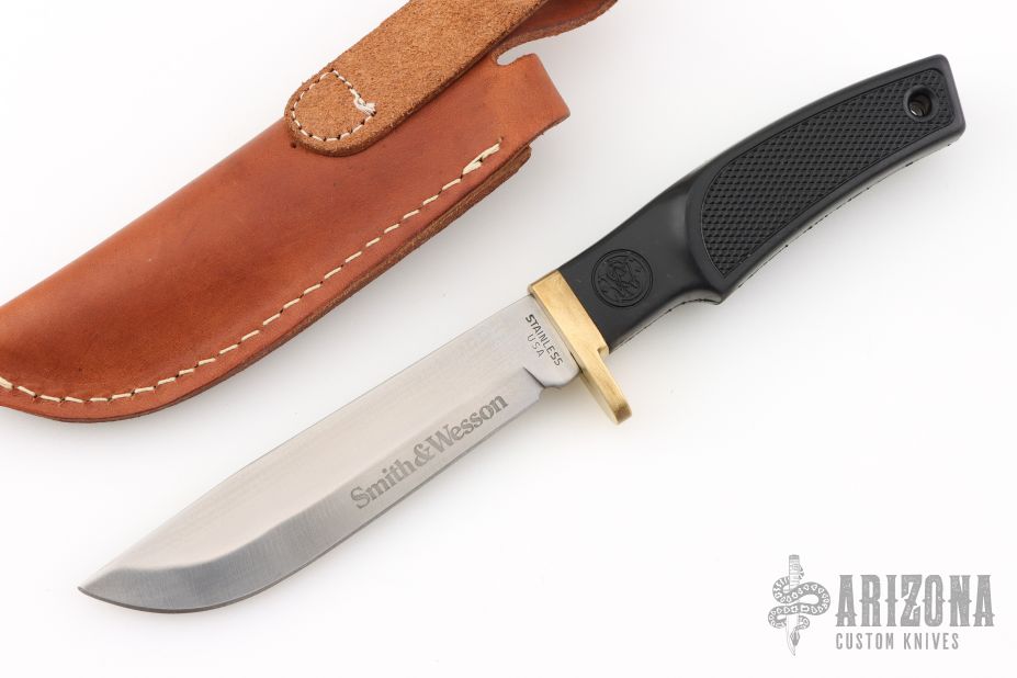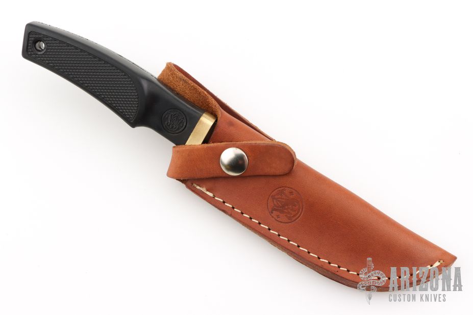 With the success of the Maverick and Ultra-Thin, in 1981 Smith & Wesson introduced the American Series consisting of 4 fixed blade knives. Constructed of 440 Stainless steel with a “Posi-Grip” handle of rubber directly molded to the full tang blade with a heavy brass hilt to protect the hand. They were offered in four popular styles, Large Upsweep, Small Upsweep, Light Duty and Heavy Duty.