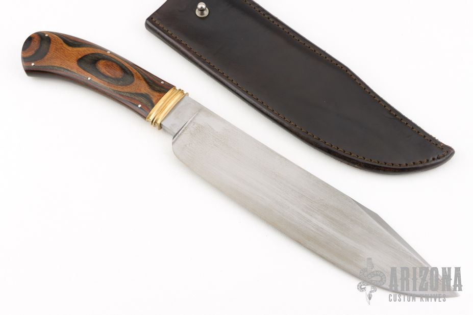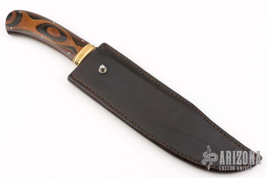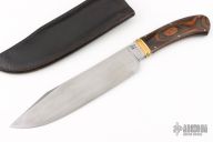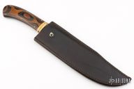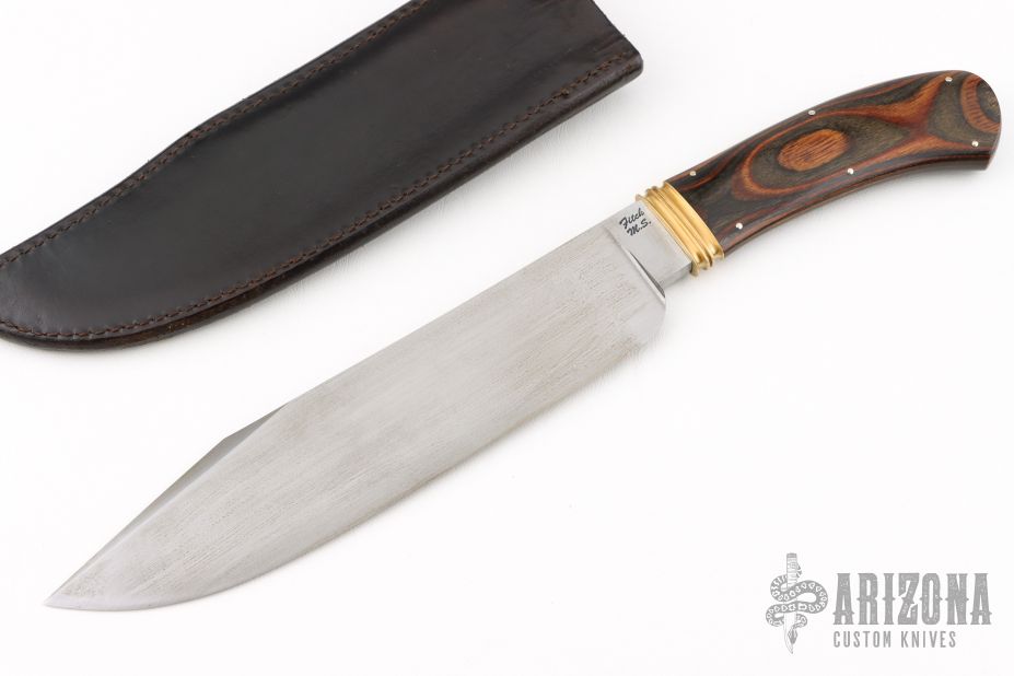 This Bowie from Master Bladesmith John Fitch features a hand rub satin finished blade with a nearly sharpened top edge, .331" blade stock and 2.048" blade depth, hidden tang construction. The handle has a fluted brass guard with a laminated wood grip with nickel silver pins. Comes with a black leather sheath with belt stud. Comes with a zippered case. Has some light oxidation and patina on the blade, otherwise excellent condition.