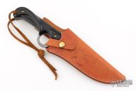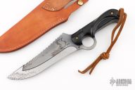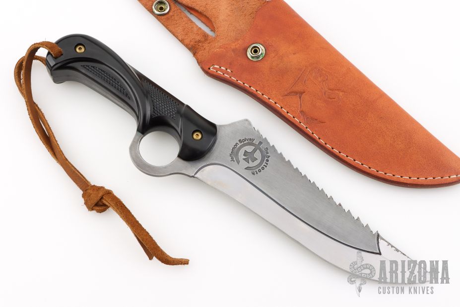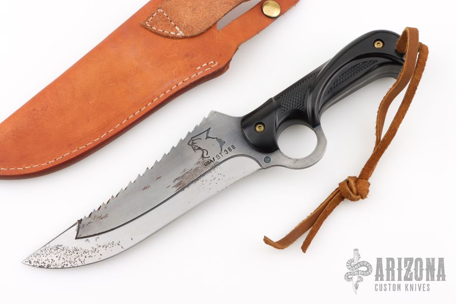 The classic double row of biangular teeth on a sloping spine is the most effective saw on a knife ever designed. in tests, the saw cut through a 1 ¾ inch iron pipe and show no damage to the teeth, So cutting bone or wood will be an easy task. Made with steel used for tank armor, you can be sure the Sabertooth is tough. The knives are individually serialized and fitted with high-impact handles and a leather sheath with a security-strap."