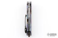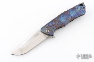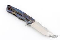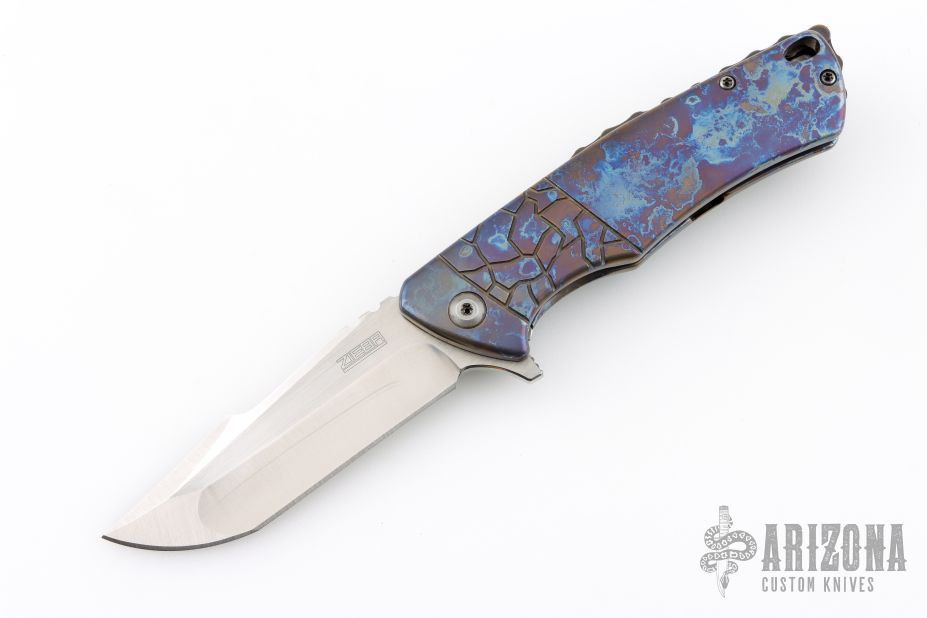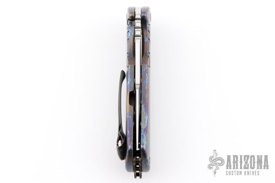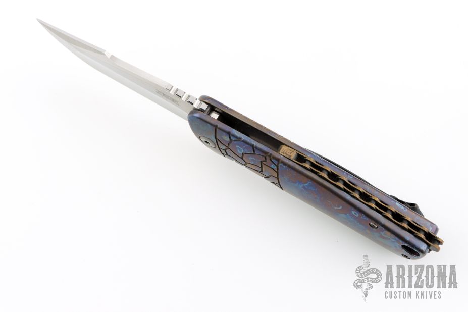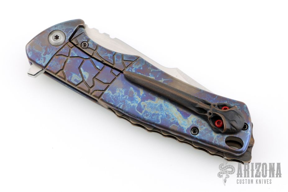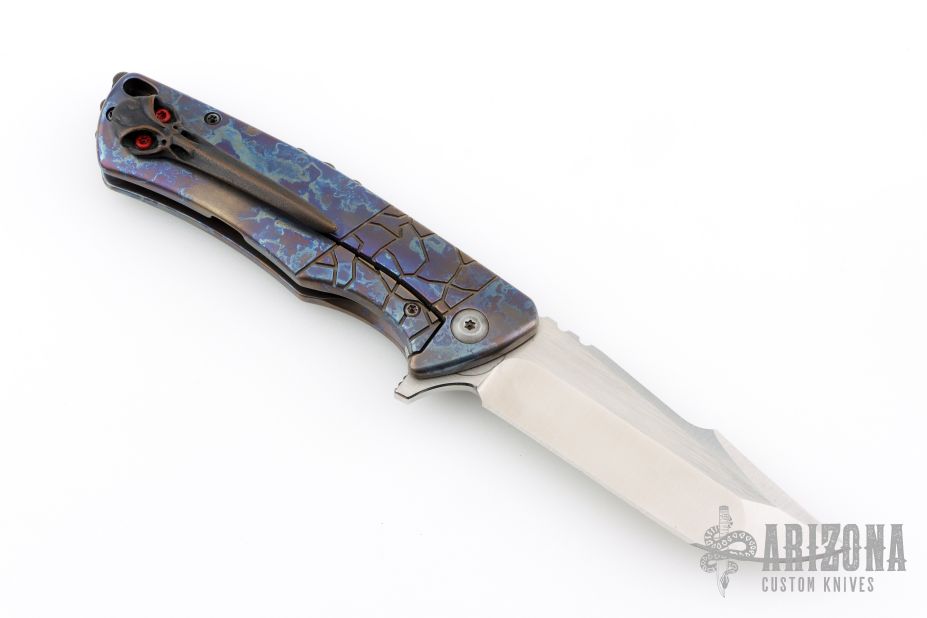 This Framelock Model S4+ by Michael Zieba features a satin finished blade with notched thumbrest and flipper. The handle has an anodized titanium frame with a custom "Angry Bird" tip up clip with red screws and a copper chain style backspacer. Nice detent, lockup and blade seating. Has bearings and a ceramic detent ball. Comes with original box, COA, extra clip, tool, and bird skull bead. Excellent condition.