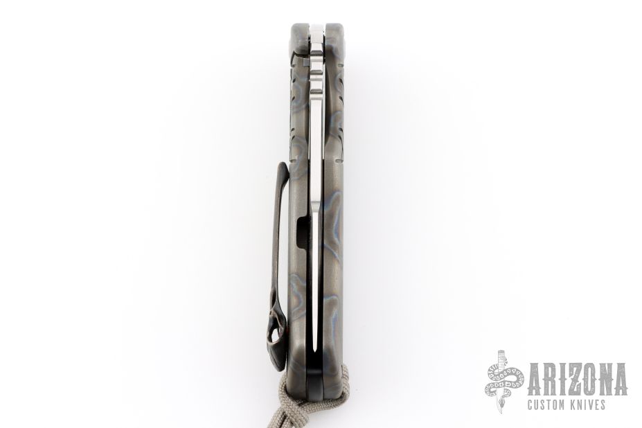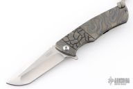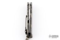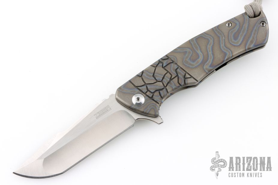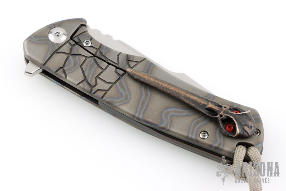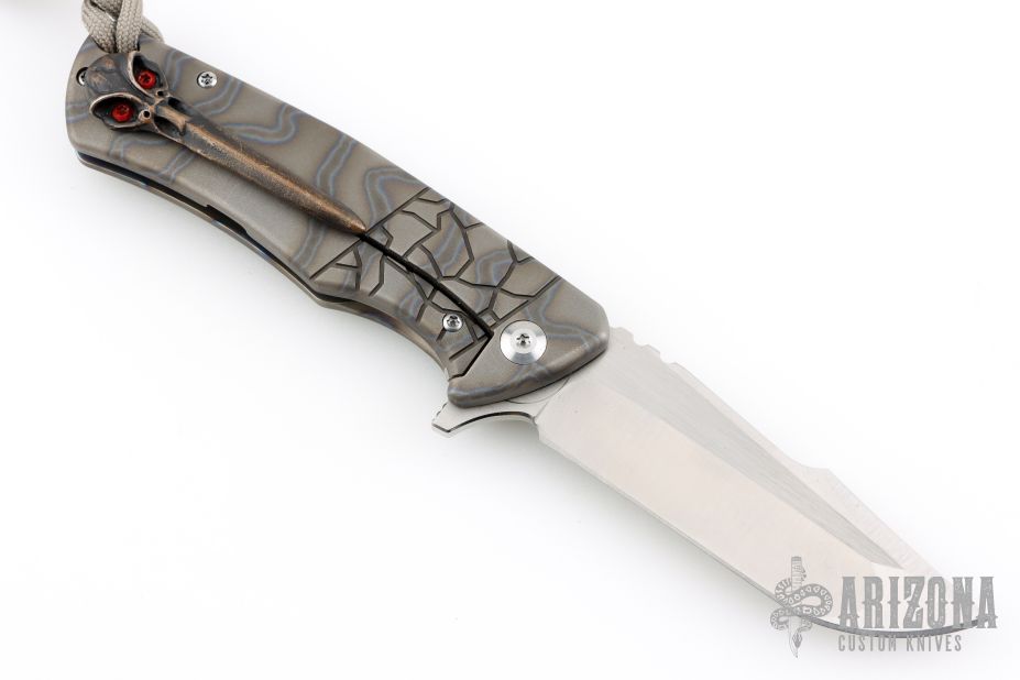 This Framelock Model S4+ by Michael Zieba features a satin finished blade with notched thumbrest and flipper. The handle has a flame-finished titanium frame with a custom "Angry Bird" tip up clip with red screws and a copper backspacer. Nice detent, lockup and blade seating. Has bearings and a ceramic detent ball. Comes with original box, COA, extra clip, tool, and bird skull bead (attached). Has light scuffs and scratches throughout, good condition; great user condition otherwise.