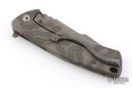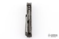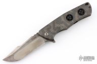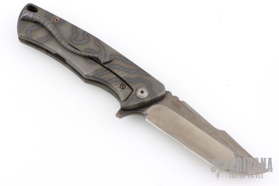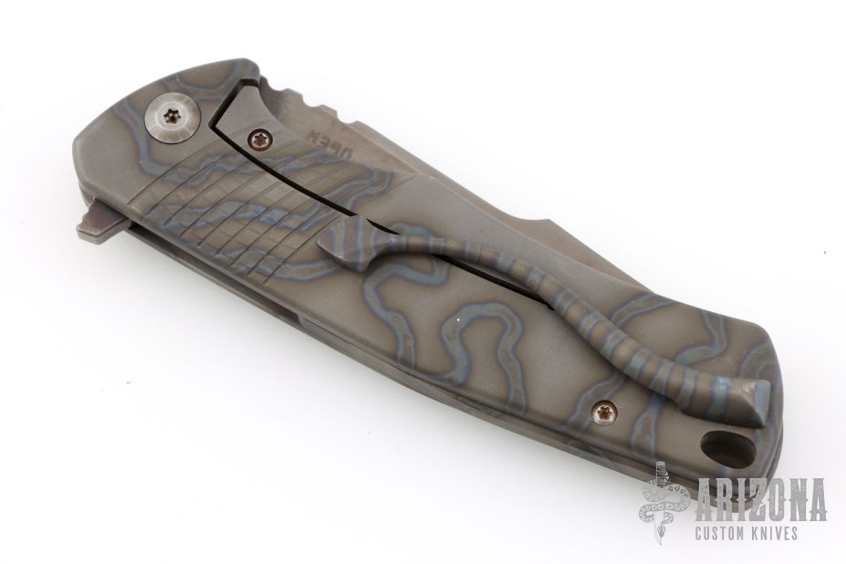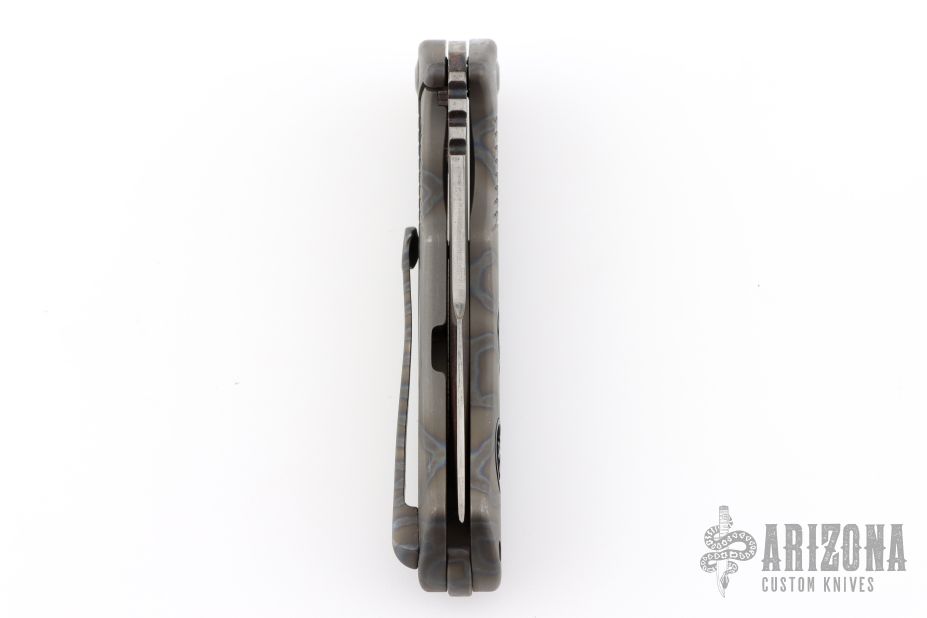 This Framelock Model S2 by Michael Zieba features a distressed blade with notched thumbrest and flipper. The handle has a flame finished titanium frame with a matching tip up clip and backspacer. Nice detent, lockup and blade seating. Has bearings and a ceramic detent ball. Comes with original box and papers. Has some scuffs and scratches, great overall condition.