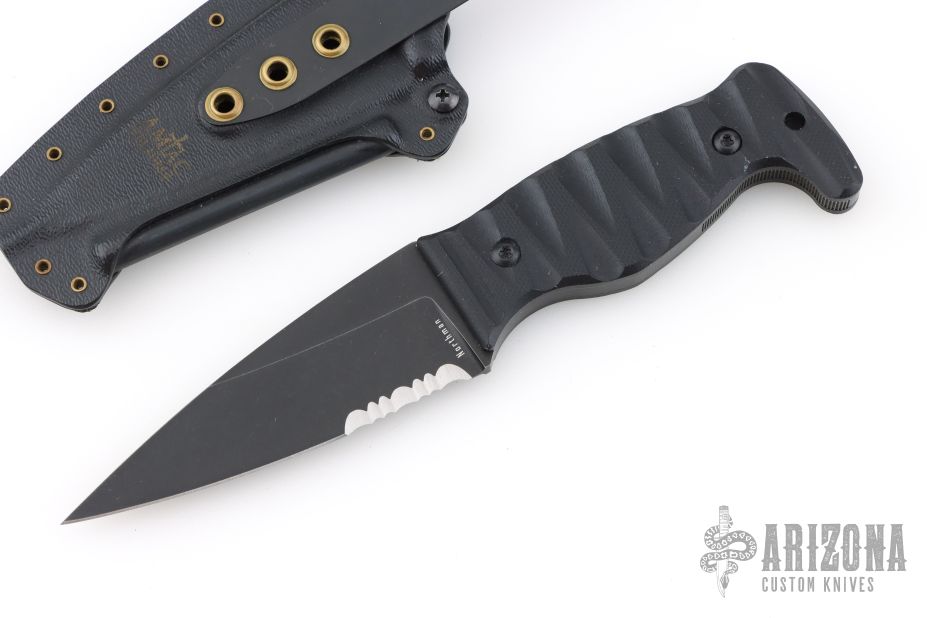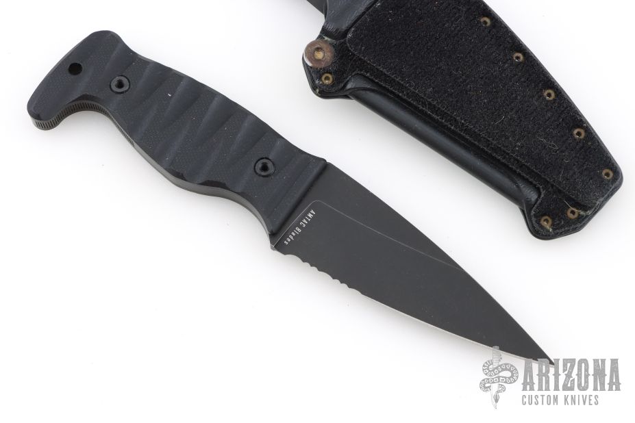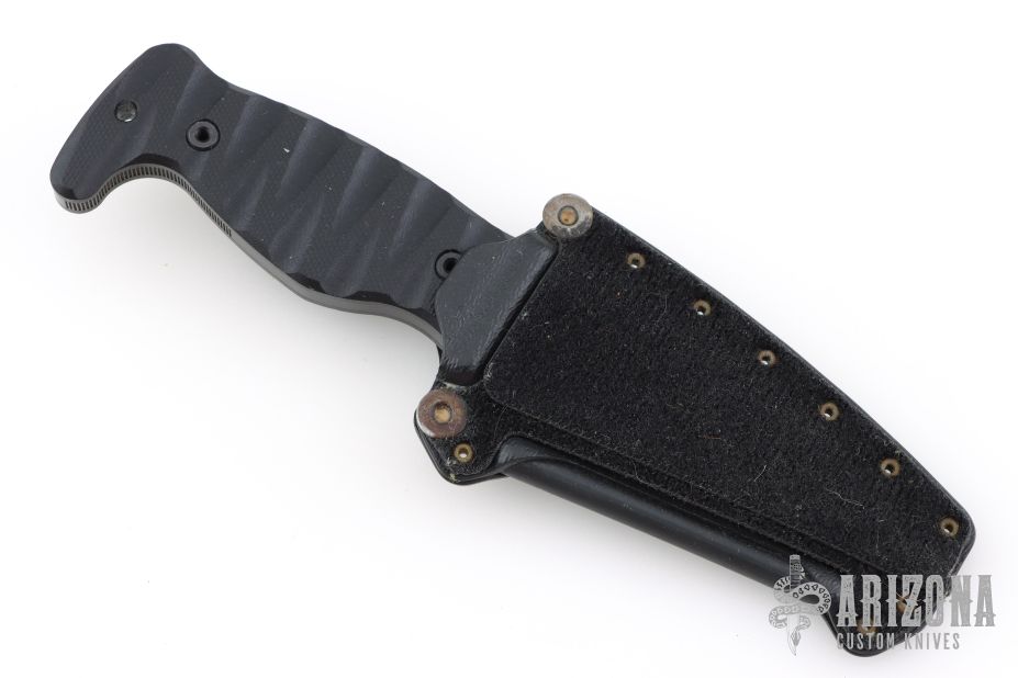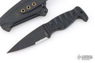 Has a black stonewashed partially serrated blade with .160" blade stock and 1.212" blade depth, full tang construction with black G-10 scales. Comes with an ambidextrous kydex sheath with velcro loops on one side and a metal clip on the other. The sheath also holds a fire steel in the sheath. Comes with original box and papers. Excellent condition. #0415