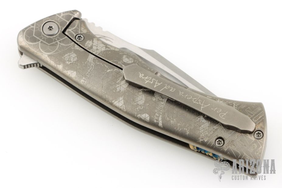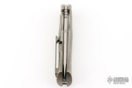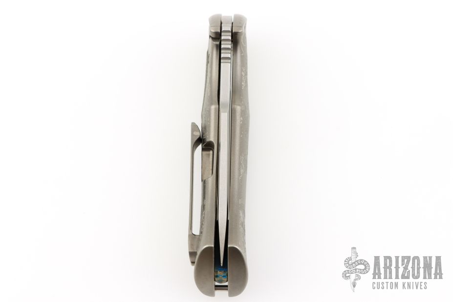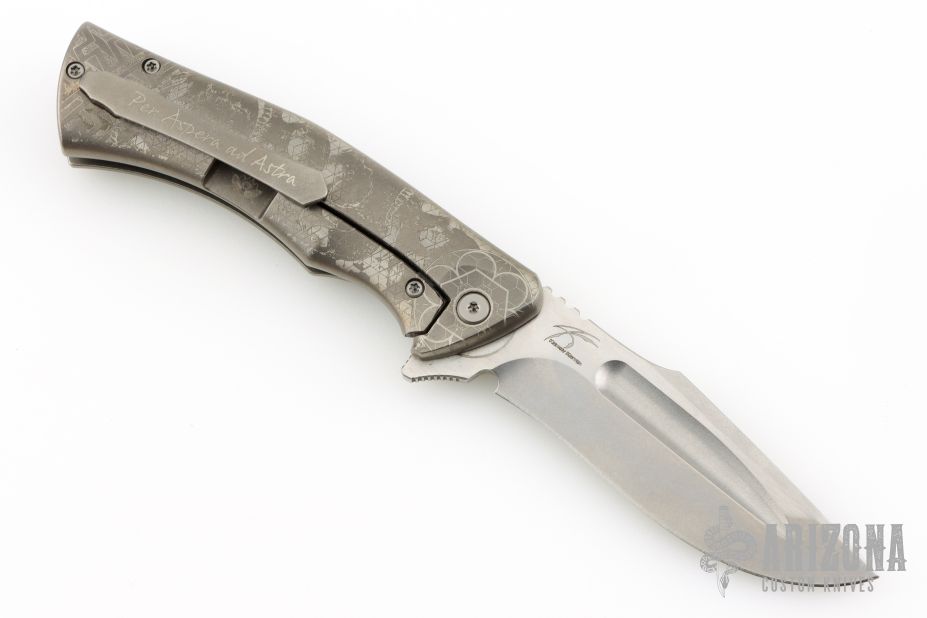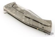 This S5 is an impressive collaborative knife design from Zieba Knives and Jason Knight. Its rounded titanium frame lock handle is contoured for comfortable use, and has a laser engraved finish. The knife sports a unique harpoon style recurve stone wash finished blade with stylized grooves and a flipper tab. The knife comes complete with a machined titanium pocket clip for secure tip-up carry. Titanium handle construction provides a durable, lightweight frame. Steel lock bar insert for secure over-travel protection. Ceramic ball-bearing pivot makes blade deployment a snap. Comes in maker's zipper case with COA. Has a couple light scuffs, excellent condition otherwise.