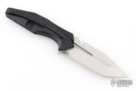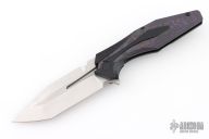 This one has a satin finished blade with notched thumbrest and flipper. The handle has a black titanium and purple haze fat carbon frame, black titanium backspacer and tip up clip with hidden screws. Comes with original box, zippered case and COA dated 12/1/23. Excellent condition.