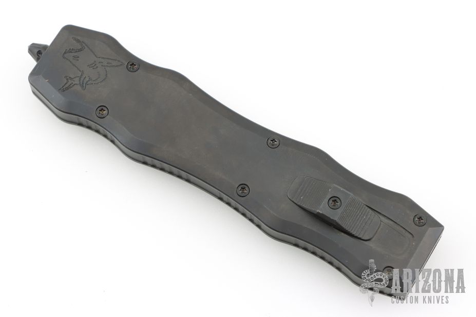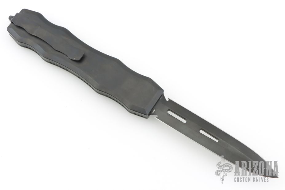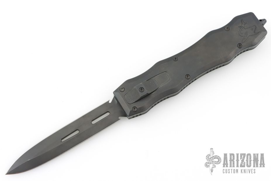 This Brand New Sand Shark OTF double action automatic by Desert Knife Works features a DLC finished double edge blade and a DLC 420 stainless steel handle with matching tip down clip. Comes with original tube and papers. Has a couple light scuffs, otherwise excellent condition.