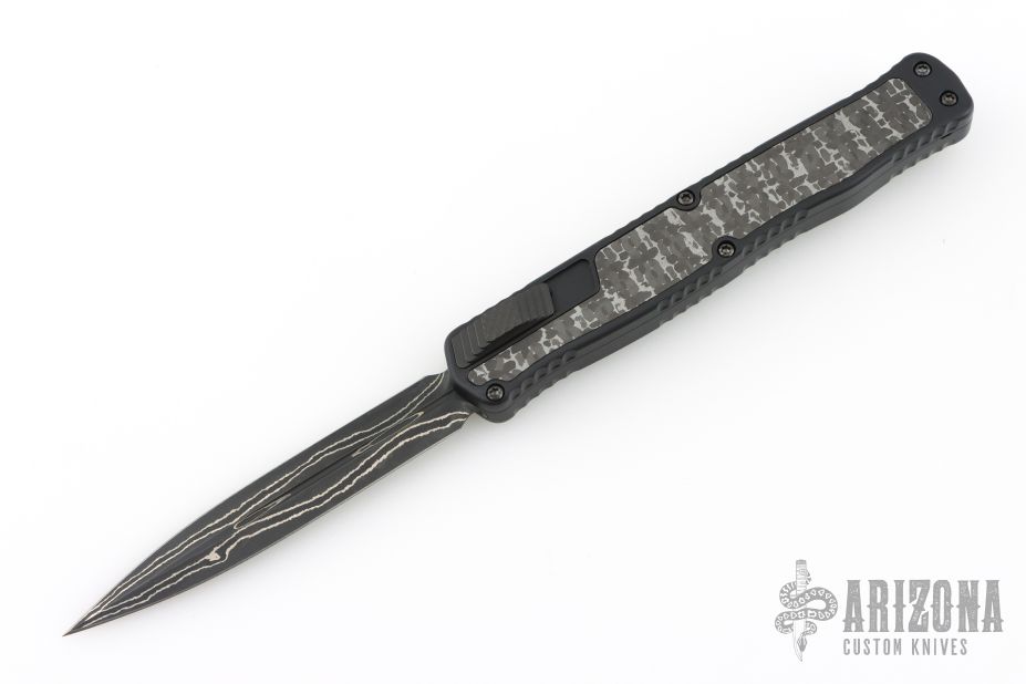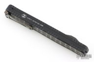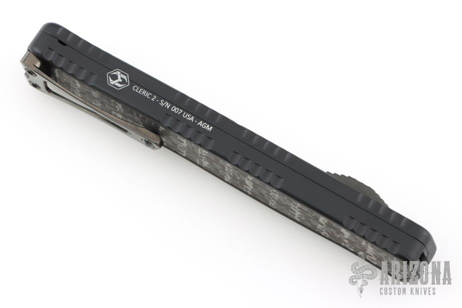 This Cleric II OTF by Heretic Knives features a Baker Forge San-Mai blade with top edge and fullers. The handle has a black aluminum frame with silver snakeskin fat carbon inlays, DLC stainless steel tip down clip with ceramic ball. Comes with original box, COA, and zipper case. Excellent condition. #007