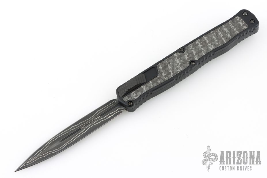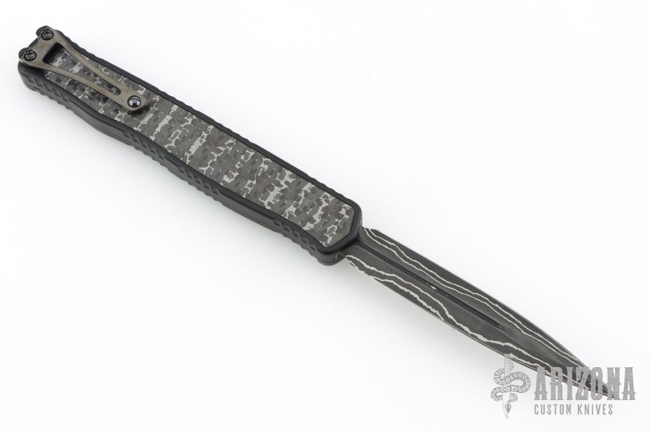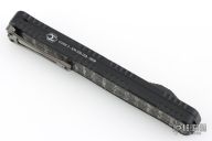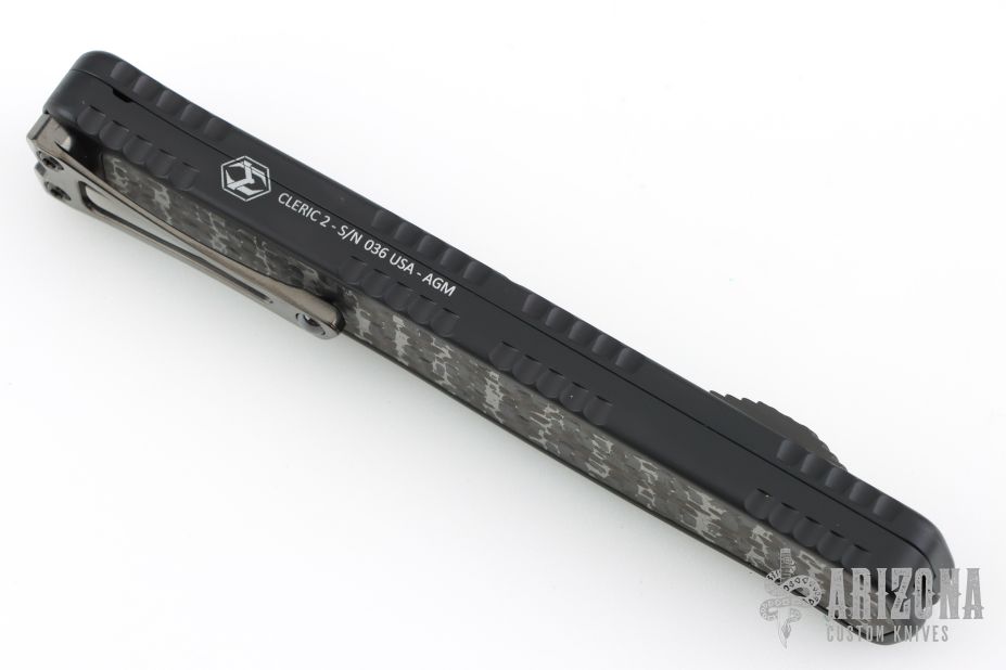 This Cleric II OTF by Heretic Knives features a Baker Forge San-Mai blade with top edge and fullers. The handle has a black aluminum frame with silver snakeskin fat carbon inlays, DLC stainless steel tip down clip with ceramic ball. Comes with original box, COA, and zipper case. Excellent condition. #036