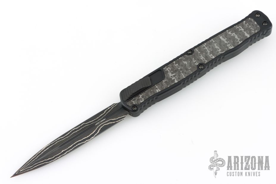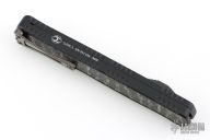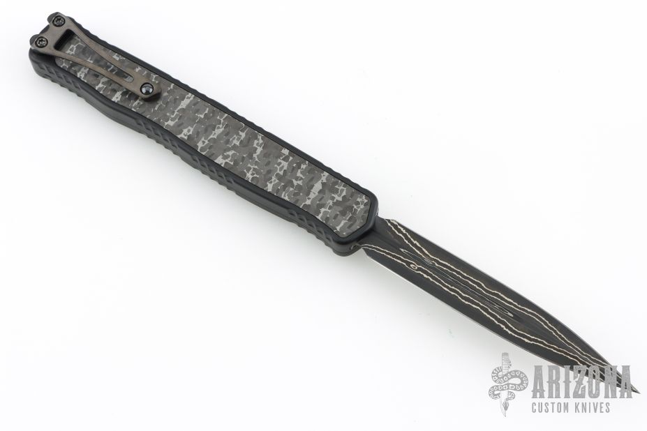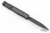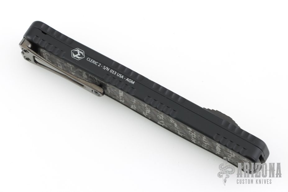 This Cleric II OTF by Heretic Knives features a Baker Forge San-Mai blade with top edge and fullers. The handle has a black aluminum frame with silver snakeskin fat carbon inlays, DLC stainless steel tip down clip with ceramic ball. Comes with original box, COA, and zipper case. Excellent condition. #013