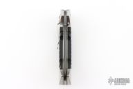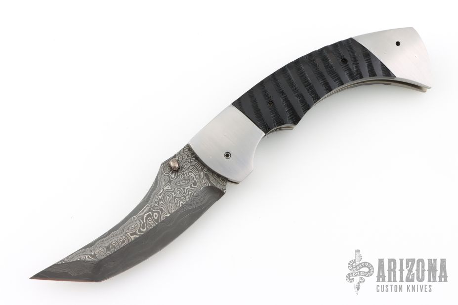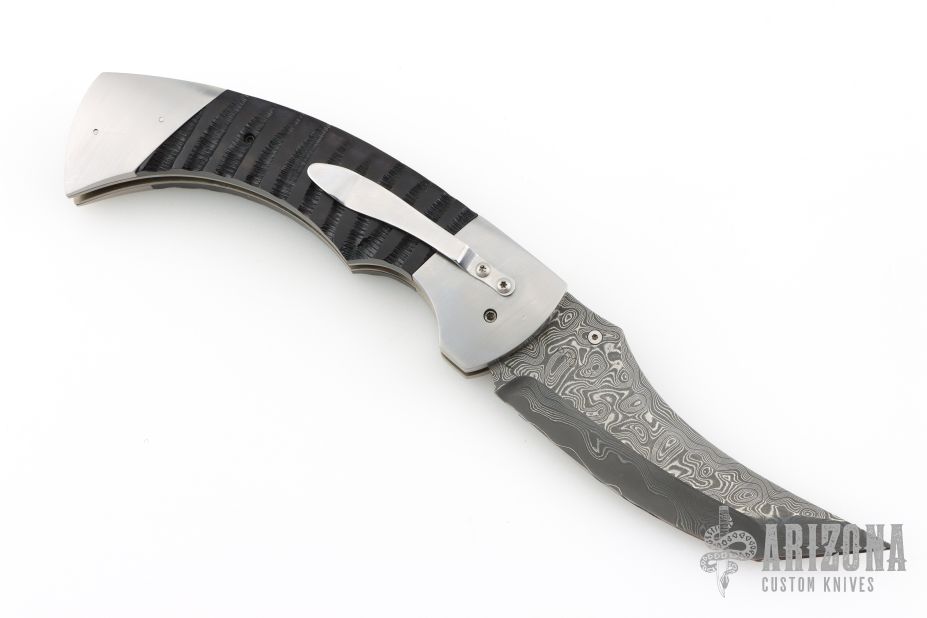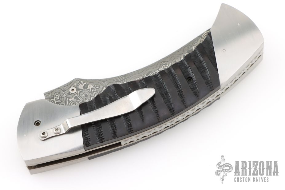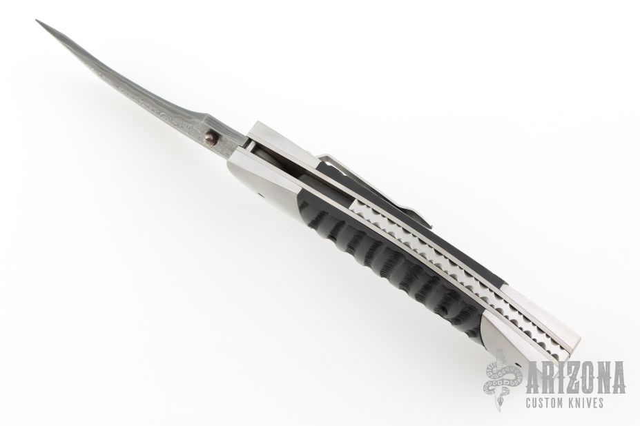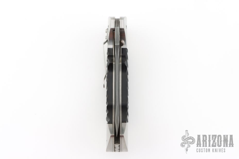 This scale release auto by Burn Knives features a San Mai Damascus blade with a single skull thumbstud. Fast and smooth action. The handle has satin finished stainless steel bolsters, front and rear, black impala horn scales, titanium liners and a fileworked stainless steel backspacer, tip down stainless steel clip. Nice detent, lockup and blade seating. Has a couple very light scratches, otherwise excellent condition. Marked BURN inside the liner and PROTO on the blade. Comes with a zippered case.