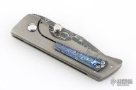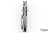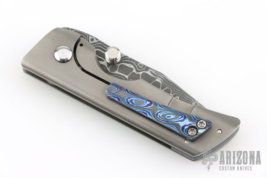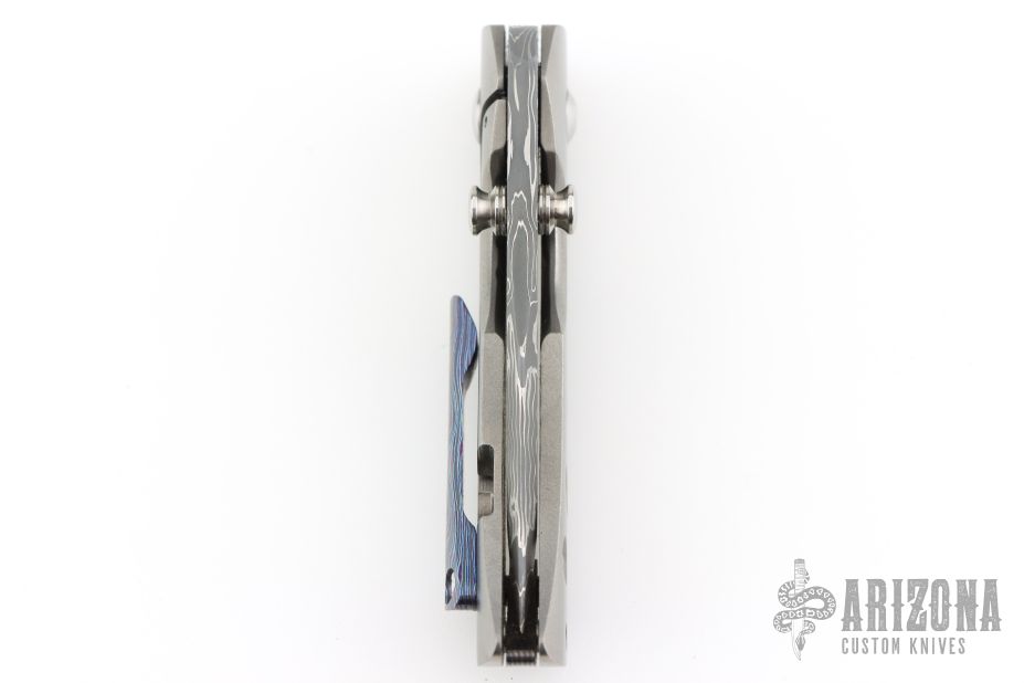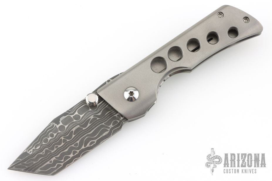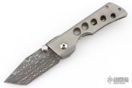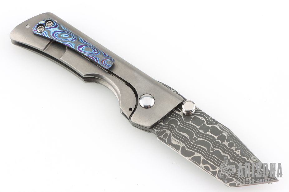This Micro 56 by Billy Cho Knives features a Nichols Stainless Damascus tanto blade with dual polished thumbstuds. The handle has bead blasted titanium frame with a black timascus floating backspacer and a black timascus tip up clip. Comes with a Steel Flame BCK molle clip and COA dated 03/2023. Nice detent, lockup and blade seating, rides on bearings. Excellent condition.