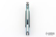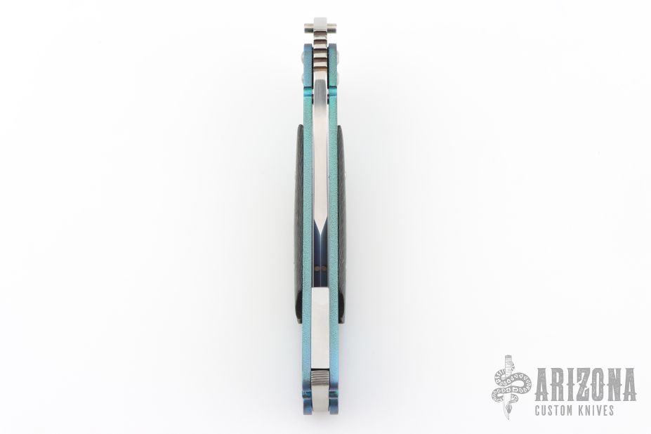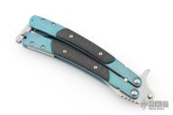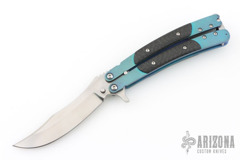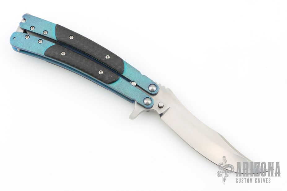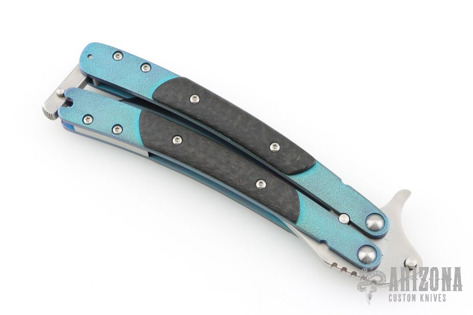 This Gargoyle balisong features a satin finished scimitar/persian blade with notched thumbrest. The handles are orange peel finished and anodized titanium with lightning strike carbon fiber scales, stainless steel backspacers and T-latch. Features IKBS. Marked "Terry Guinn PEC-003" inside spacer. Comes with zippered case. Excellent condition.