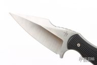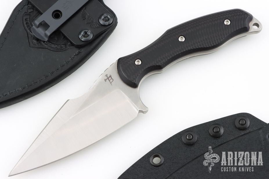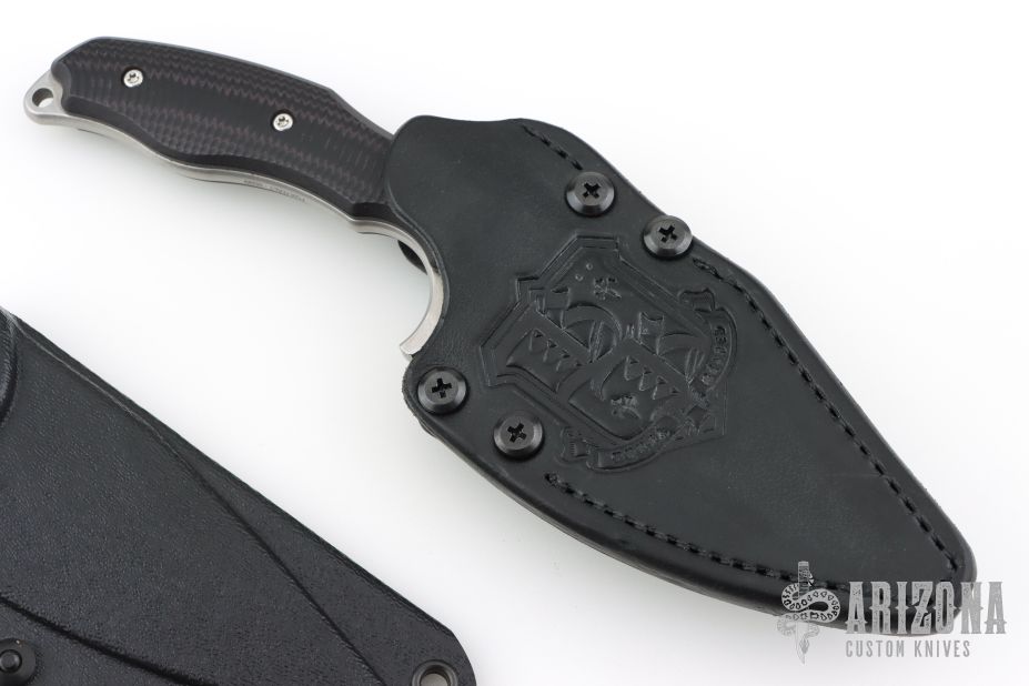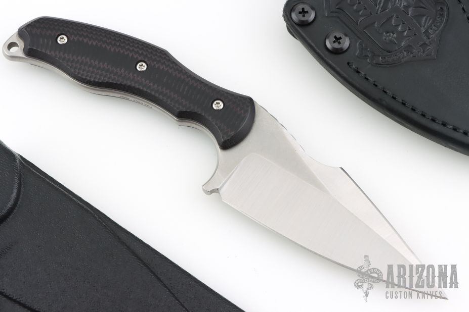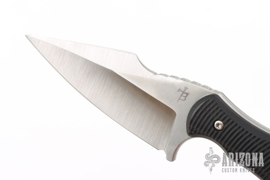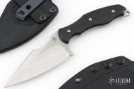 This SB1 by Fox Cutlery is a Borka Blades design, it features a stonewash finished blade with satin bevels, top edge and notched thumbrest, .195" blade stock and 1.7175" blade depth, full tang construction with black/burgundy linen micarta scales. Comes with original kydex sheath, and a Chattanooga Leatherworks IWB leather sheath. Excellent condition. This knife was hand-ground and finished by Sebastijan Brenji.