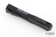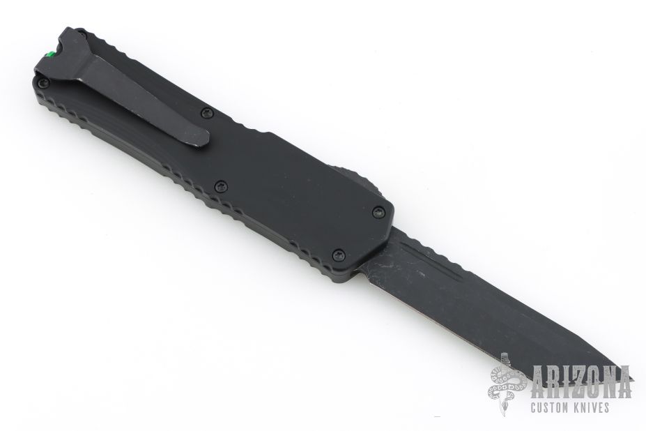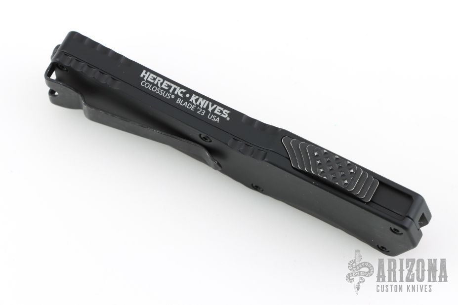 This Colossus by Heretic Knives features a black tanto blade with fullers and notched thumbrest. The handle has a black aluminum frame with green logo, checkered thumb slide, stainless steel tip down clip. Comes with original box and lube. Has a couple light marks on the clip, excellent condition otherwise.