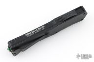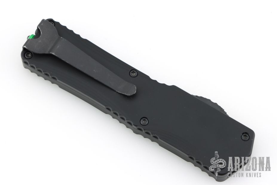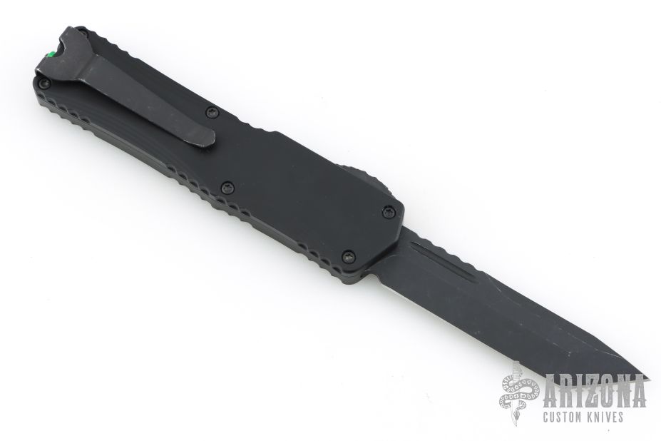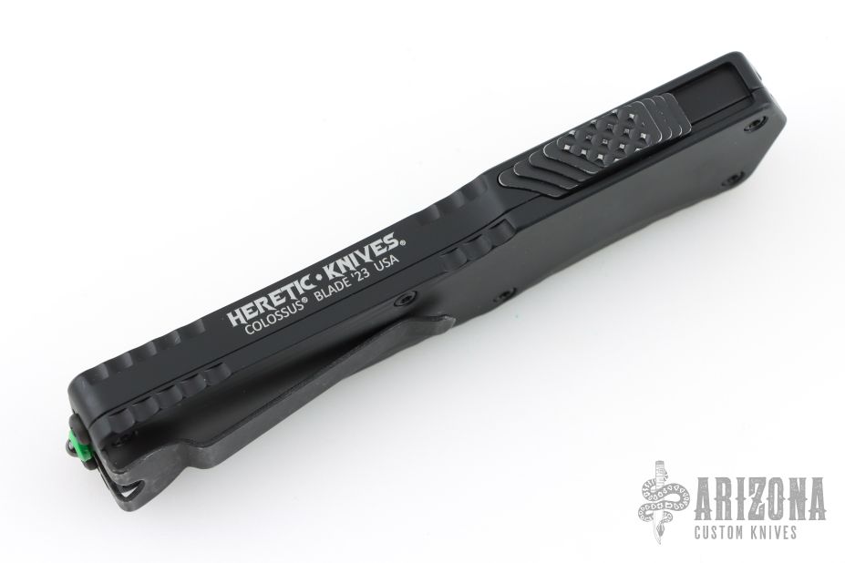 This Colossus by Heretic Knives features a black tanto blade with fullers and notched thumbrest. The handle has a black aluminum frame with green logo, checkered thumb slide, stainless steel tip down clip. Comes with original box and lube. Has a couple light marks on the clip, excellent condition otherwise.