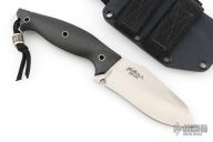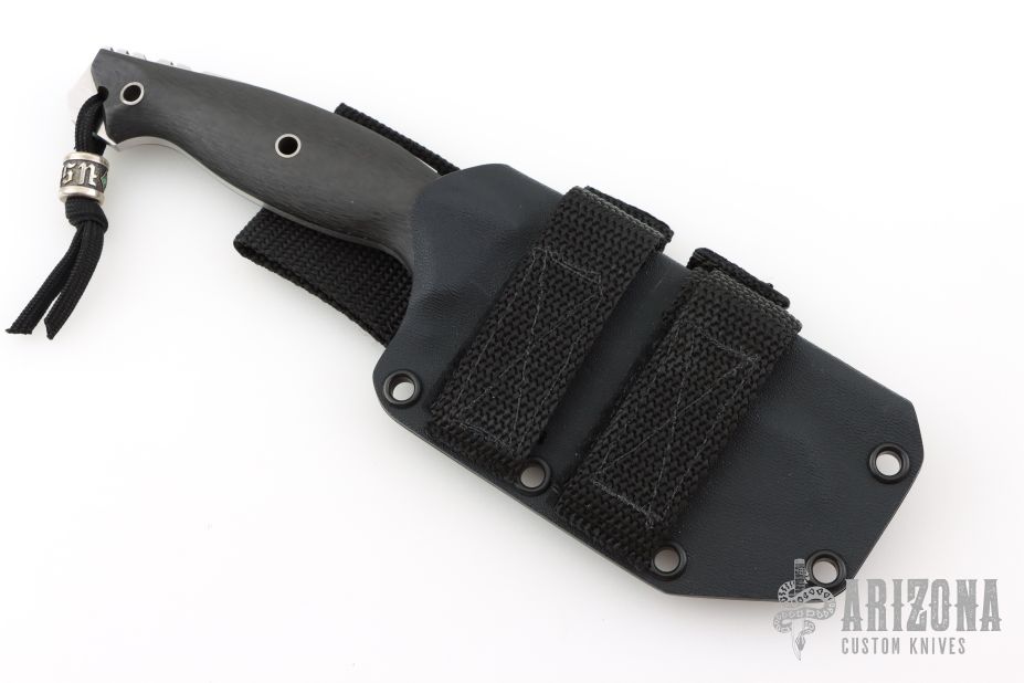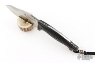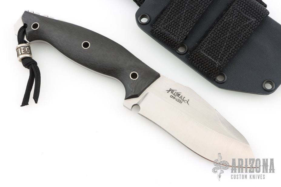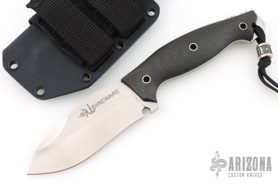 This Primal-L by Direware Knives features a satin finished recurve blade with notched thumbrest, .185" blade thickness and 1.500" blade depth, full tang construction. The handle has carbon fiber scales with hollow pins and a lanyard hole with a .925 silver USN G3 bead with green stone inlay. Comes with a kydex sheath with belt loop and a zippered case. Excellent condition.