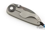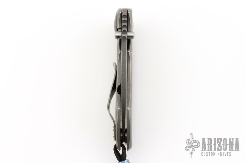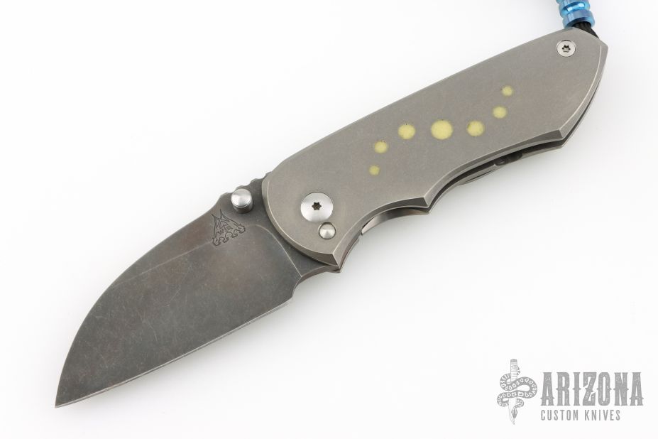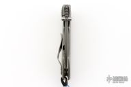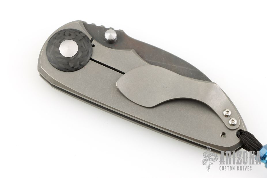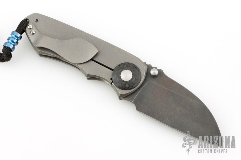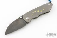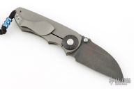 This framelock folder by Walter Randolph features a black stonewashed blade with notched thumbrest and dual thumbstuds. The handle has a stonewashed titanium frame with glow dot inlays on the front, carbon fiber pivot collar,  tip up stonewashed titanium clip. Nice detent, lockup and blade seating. Comes with plastic case. Excellent condition.