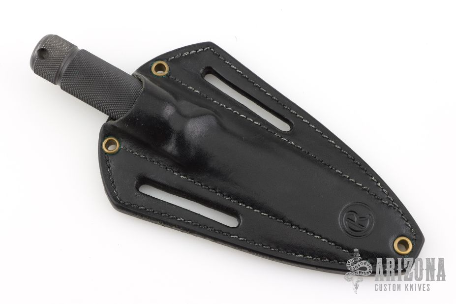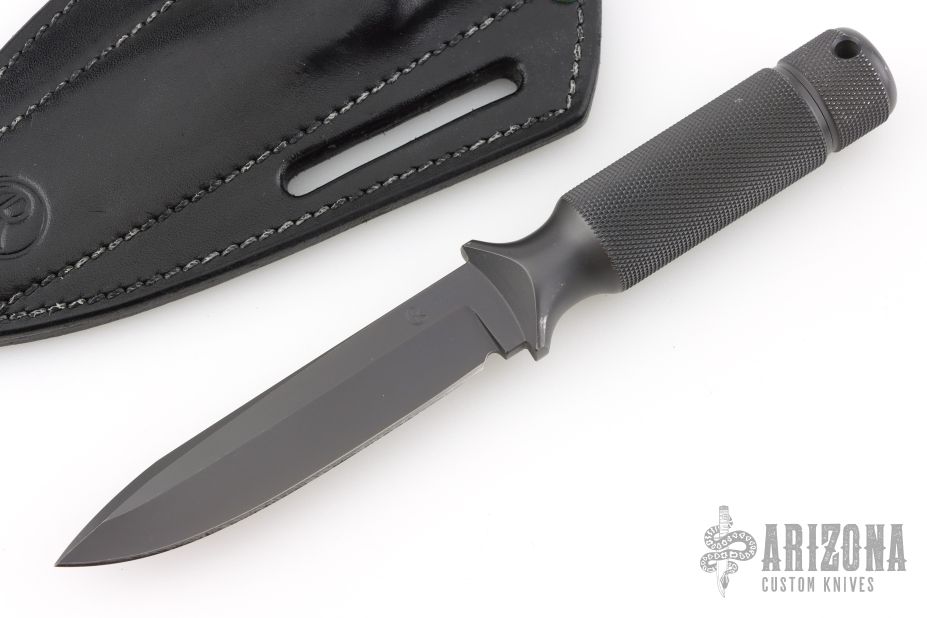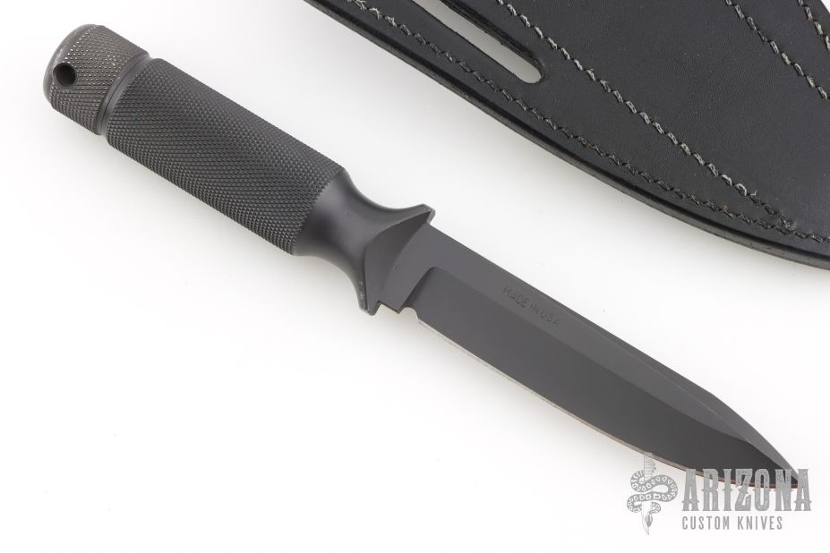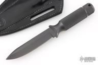 "Designed to incorporate the two basic criteria required in knives destined for hard field usage, these spear-points have plenty of blade weight and good strong points. This design has been used by soldiers all over the world who have found them to be extremely good weapons as well as rugged dependable tools. The 4” bladed Shadow III is a good everyday carry knife. " Knife and sheath are in excellent condition. The blade has a false top edge, .183" blade stock and .842" blade depth, integral construction with hollow handle. Comes with original box, black leather sheath, and COA dated November 21, 2000. Has some scuffs and scratches, great condition otherwise.