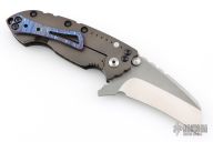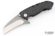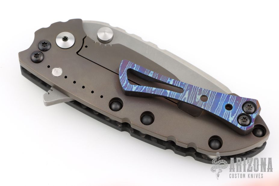 This Solo framelock flipper from Direware Knives features a carbon fiber and anodized titanium frame with a timascus pocket clip. The massive tumble finished blade is .182" thick and 1.651" deep. Smooth flipping action that requires no wrist movement with a strong lock up, nice detent and blade seating is dead center. Clip can be positioned for tip up or tip down carry. Excellent condition. Comes with original box and original titanium clip.