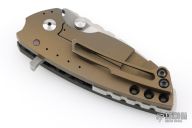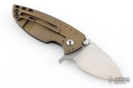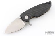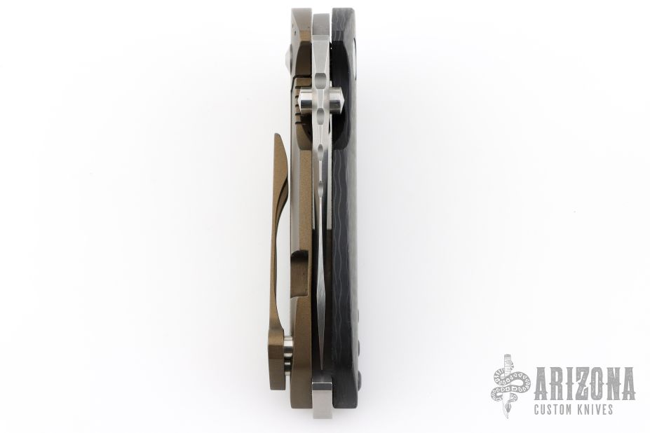 This Solo framelock flipper from Direware Knives features a hand rub satin finished blade with notched thumbrest and flipper. The handle has a carbon fiber and bronze anodized titanium frame and matching pocket clip. Smooth flipping action that requires no wrist movement with an early and strong lock up, nice detent and blade seating is dead center. Excellent condition, shows no signs of use/carry. Comes with original box.