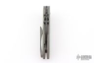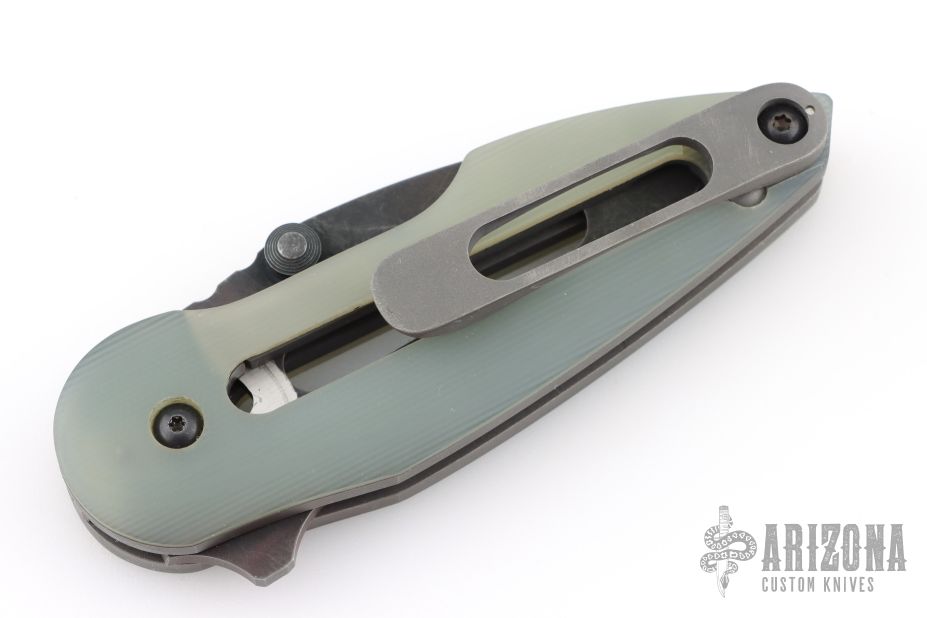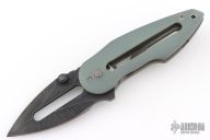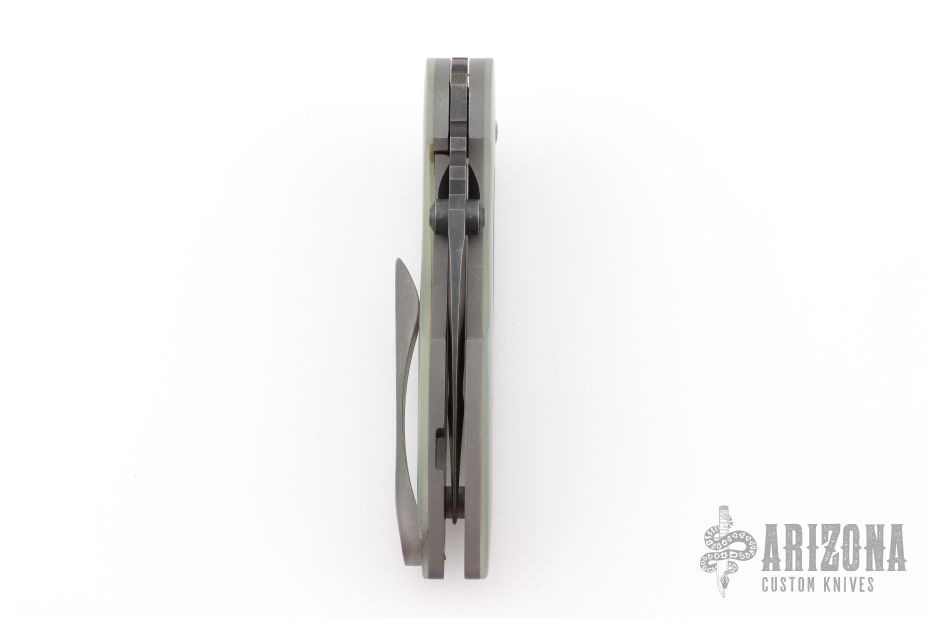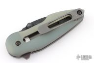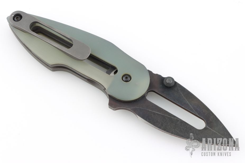 This Rare Slotted Projectile by Direware features a black tumble finished slotted blade with notched thumbrest, flipper and dual thumbstuds. The handle has sloted jade G-10 scales, stonewashed titanium liners with a matching tip up clip. Nice detent, lockup and blade seating. Rides on bearings. Comes with original box. Has some light scratches on the clip, otherwise excellent condition.