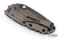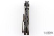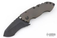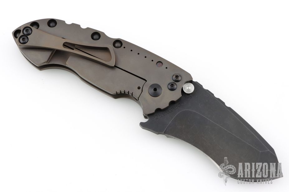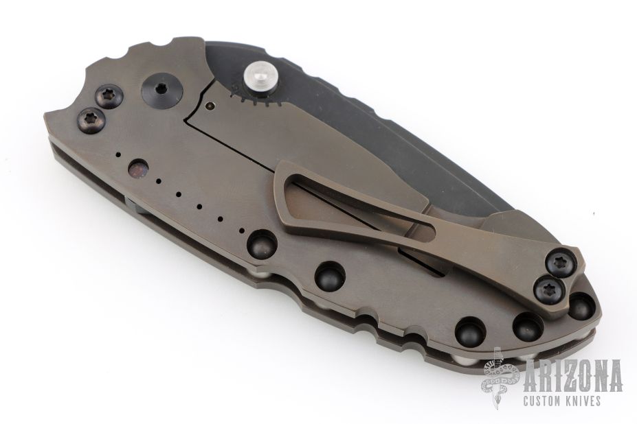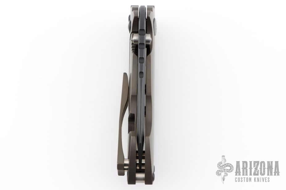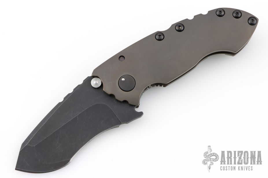 This Solo framelock by Direware features an anodized titanium frame with a matching tip up clip. Black stonewash finished blade with a thickness of .188", notched thumbrest and dual thumbstuds. Smooth function with a strong lock up, nice detent and blade seating is dead center. Excellent condition. Comes with the original box.