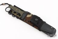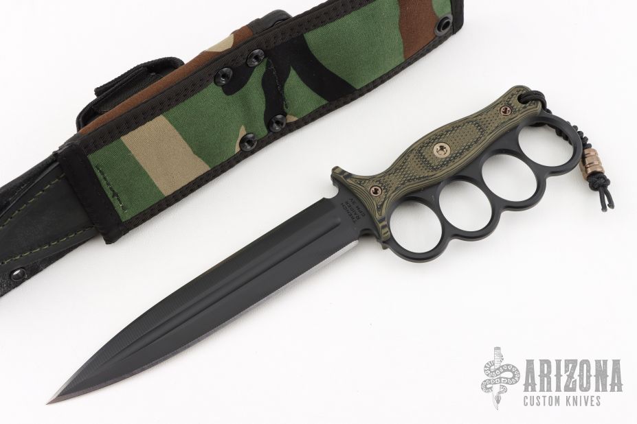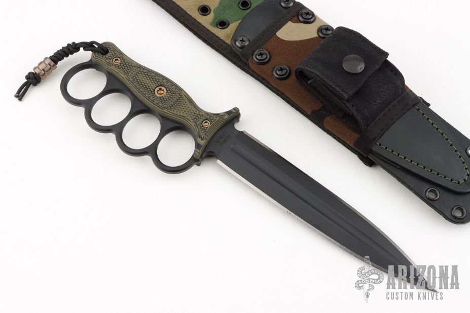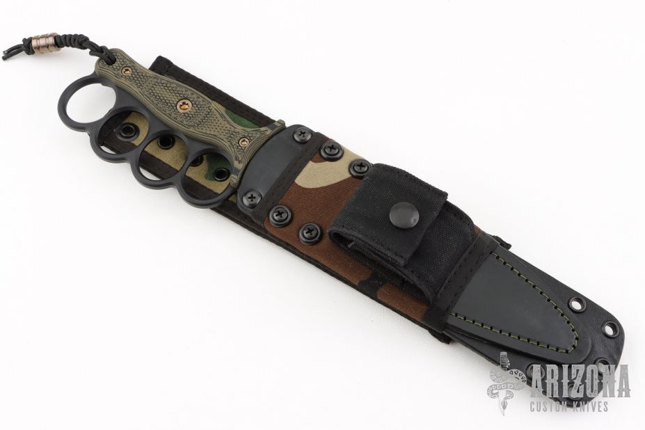 Embodying history and our own design philosophies, the Trench Raider is our rendition of the classic trench knife. We decided to make something that was more true to size vs the behemoth that is Lady Death. The Trench Raiders overall length is 11 3/8" overall length, and has a 7 3/16"" CPM-3V double-edge dagger blade featuring a long fuller down the center. The knuckle duster style handle acts as a guard to protect your hands, and the aggressive outward shape works well for raking. A small detail regarding the knuckles, the style is patterned after the knuckles that President Lincoln's bodyguard carried. The handle is finished with G10 scales with a checkered texture that is suitable in dry or wet conditions. The handles are attached with Grade 5 Titanium fasteners that are electro-anodized in bronze to round out the look. Trench Raider includes a leather and canvas sheath that has a pouch for a lighter mounted on the front. There is also a lighter included, most look like what is pictured, however there are some easter eggs mixed in. The sheath is ambidextrous, and can be worn on a belt or attached to PALS webbing.