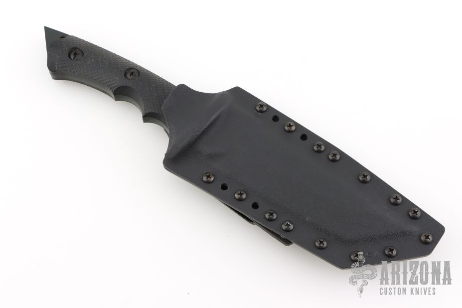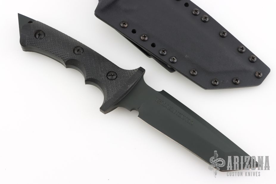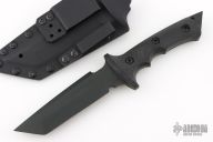 This Ultra Phalanx has a Cerakote finished stainless steel tanto blade with chopper top edge and full tang. .252" blade stock, 1.67" blade depth. Handle is black micarta with matte-black finished stainless steel screws, and extended tang-butt glass breaker and lanyard. Comes with a Kydex belt sheath. Excellent condition.