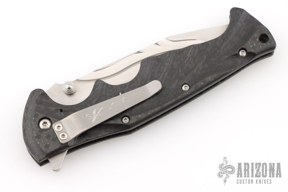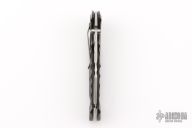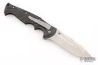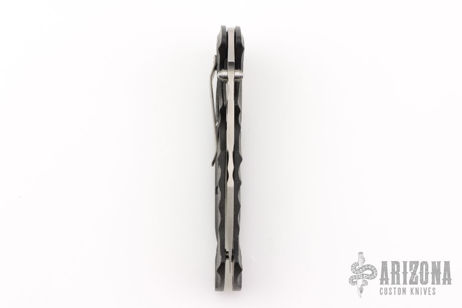 This Tighe Breaker Linerlock Flipper by Brian Tighe features a hand rub satin finished blade with dual thumb studs, notched thumbrest and a flipper. The handle has a milled carbon fiber frame with deep finger grooves and tip down titanium clip, lanyard hole at the butt. Smooth flipper action. Nice detent, blade seating and lockup. Has a couple light scratches, excellent condition otherwise.