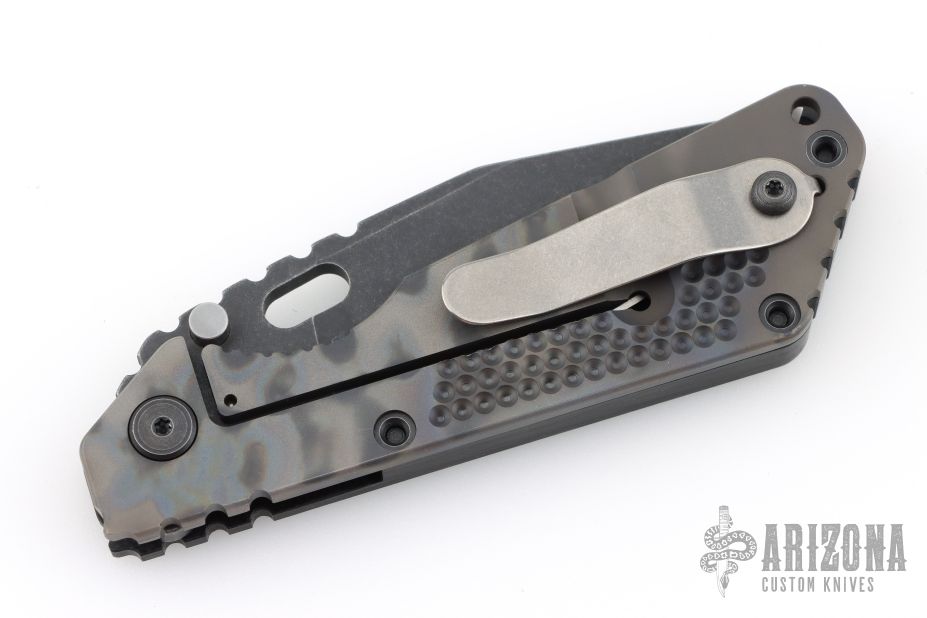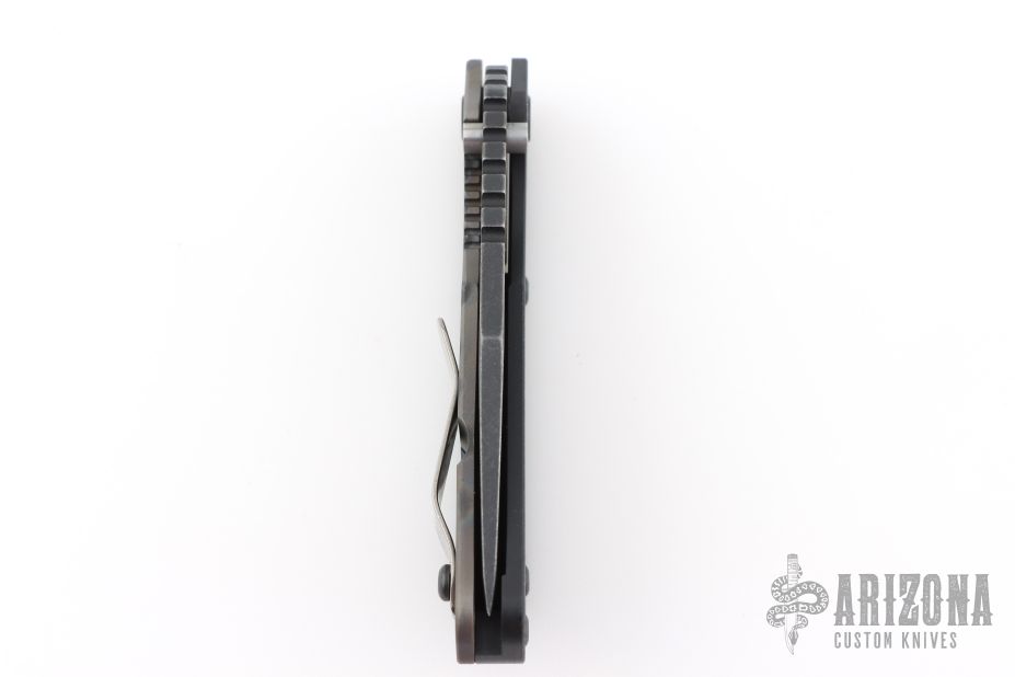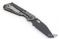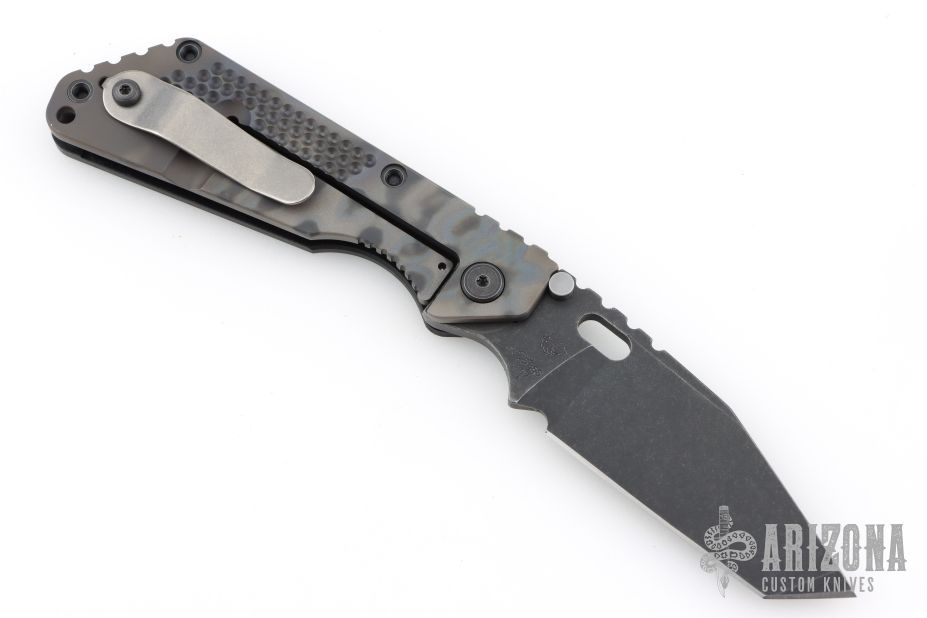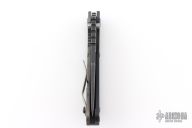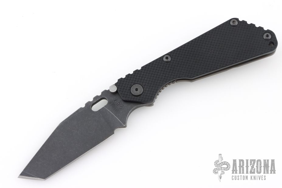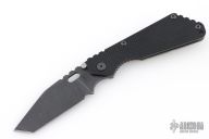 This SnG GenII by Strider features a black stonewashed tanto blade and a black G-10 and anodized titanium handle and a stonewashed titanium clip. Notches on thumbrest, rear of handle, and lockup. Nice detent, lockup and blade seating. Excellent. #057 on the blade