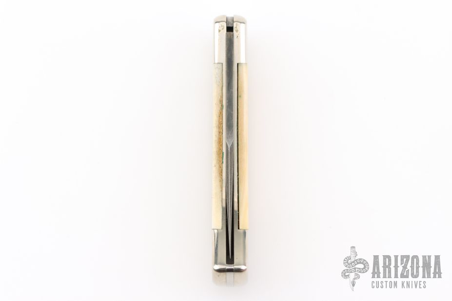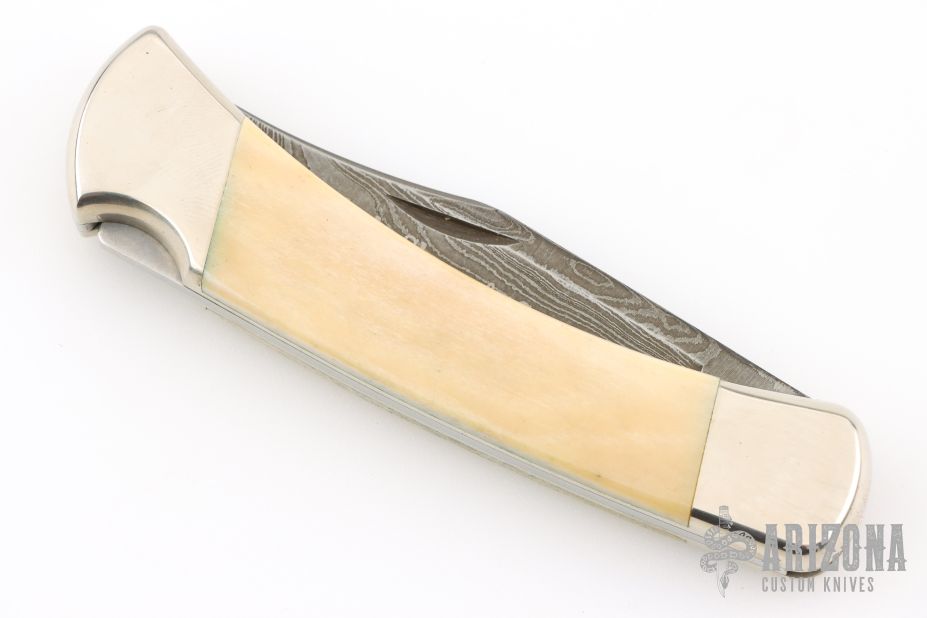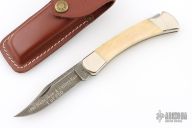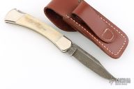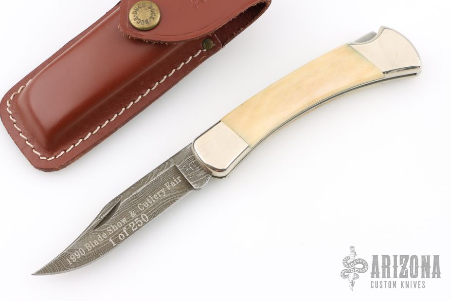 This lock back folder by Buck features a Damascus clip point blade with nail nick. The handle has nickel silver frame and smooth bone inlays. Comes with original box, papers and brown leather sheath. One of the scales has a small gap between the frame, otherwise excellent condition.  1990 Blade Show & Cutlery Fair 1of250