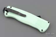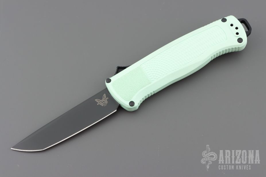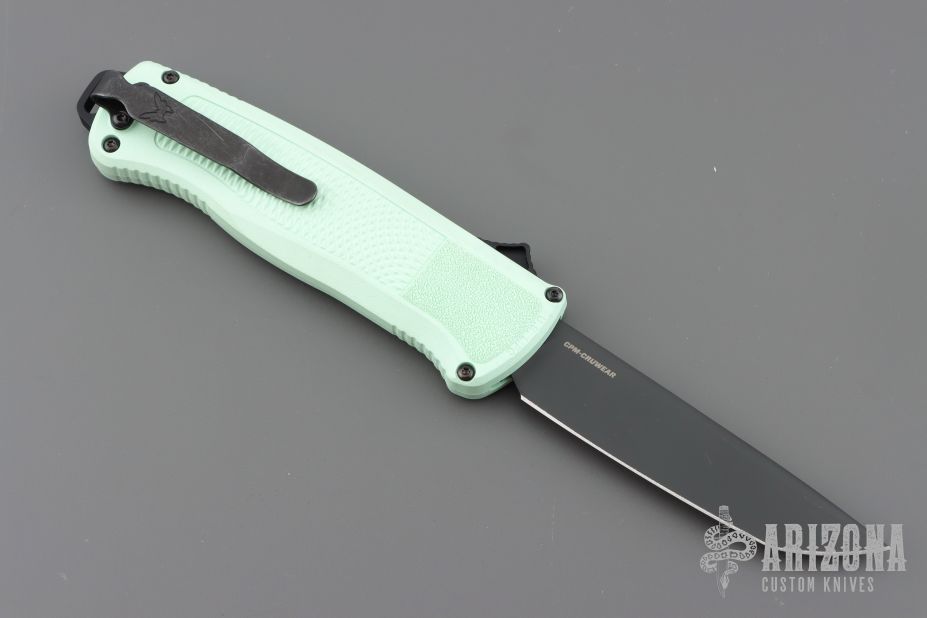 The Benchmade Shootout is a Benchmade OTF knife with some seriously great attributes. It features a lightweight Sea Foam Green Grivory handle with a reversible pocket clip, and a CRU-WEAR super steel blade with a black DLC finish.