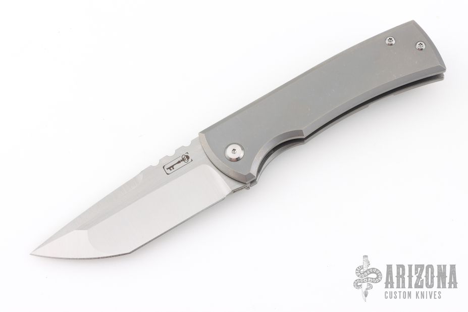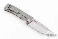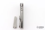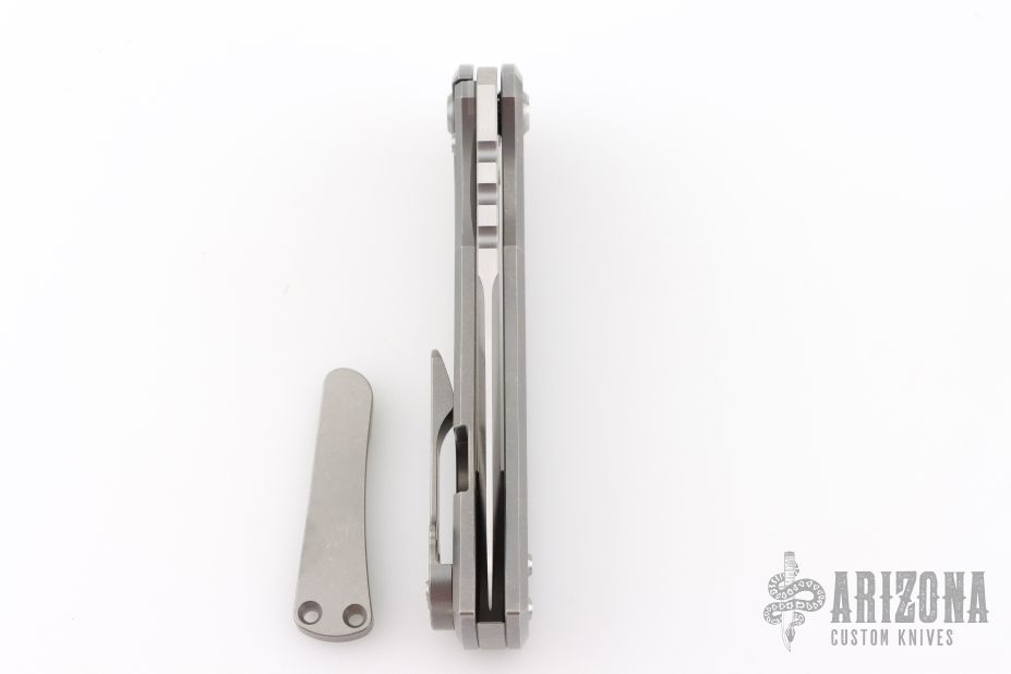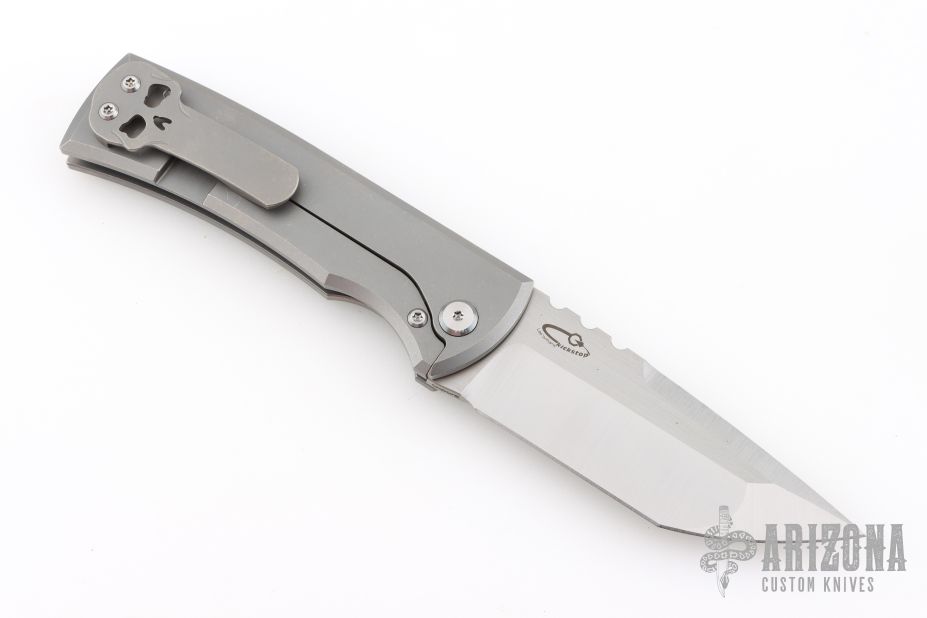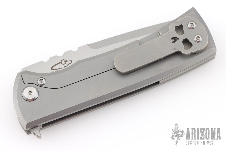This Chaves Ultramar Redencion Tanto features a satin finished blade. The handle is made up of stonewashed titanium, skull pocket clip (positioned for tip up carry), and a matching titanium backspacer. Comes with original box and an extra regular titanium pocket clip. The knife opens with the use of Lee Williams' Kick Stop flipper.  Includes the original box and extra clip. Excellent condition.