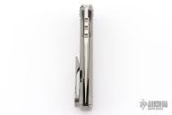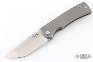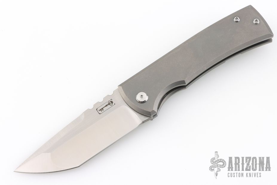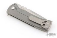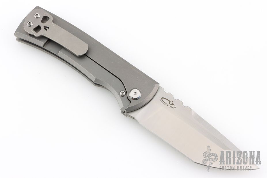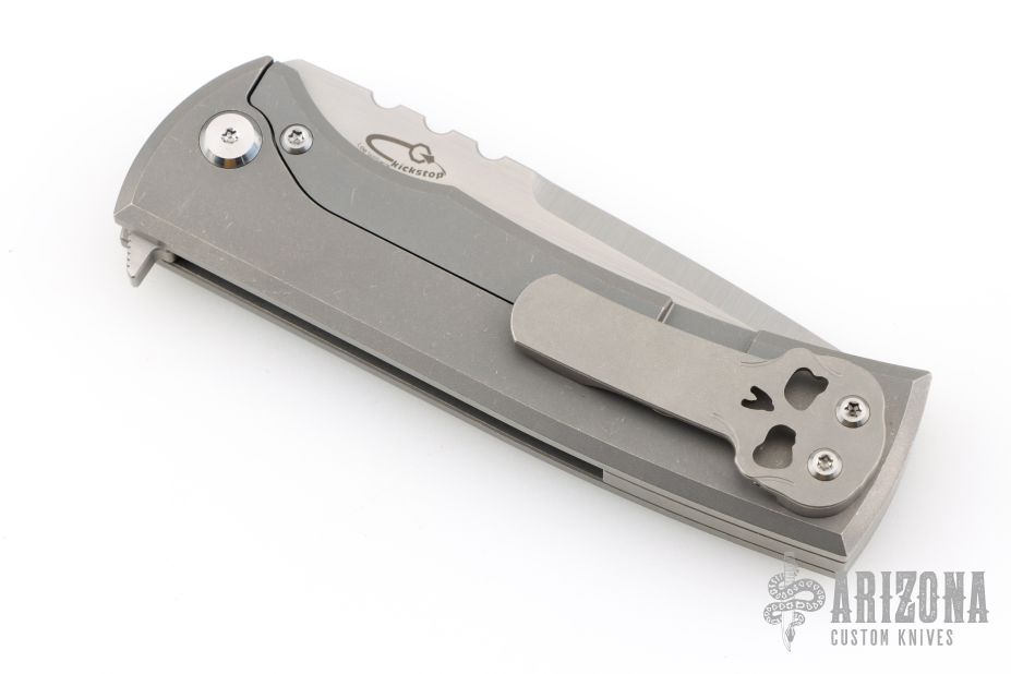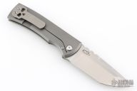 This Chaves Ultramar Redencion Tanto features a satin finished blade. The handle is made up of stonewashed titanium, skull pocket clip (positioned for tip up carry), and a matching titanium backspacer. Comes with original box and an extra regular titanium pocket clip. The knife opens with the use of Lee Williams' Kick Stop flipper.  Includes the original box and extra clip. Excellent condition.