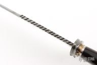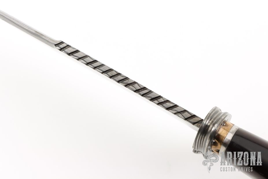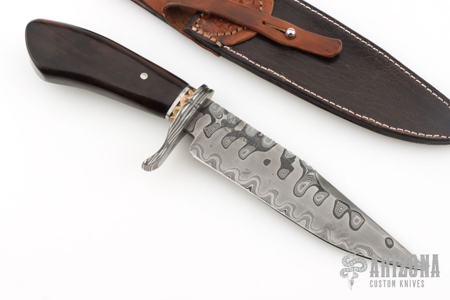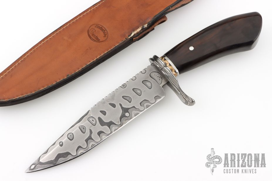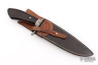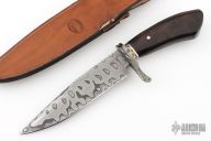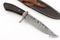 This Fighter by ABS Apprentice Randy Caston features a  Damascus (1084 and 15N20) blade with false top edge and fileworked spine, .203" blade stock and 1.623" blade depth, hidden tang construction. The handle has Damascus (1084 and 15N20) guard, African Blackwood grip, fileworked bronze and steel spacers. Comes with a hand tooled brown leather sheath and COA. New from maker. Has a few light scratches and a couple small oxidation spots.