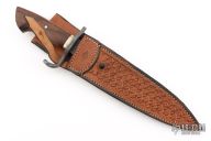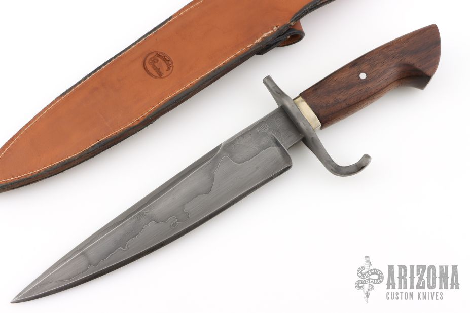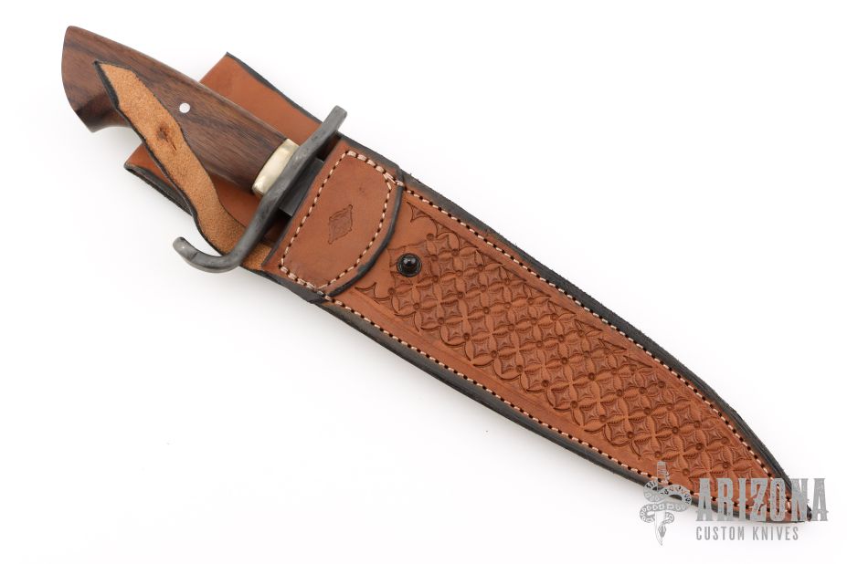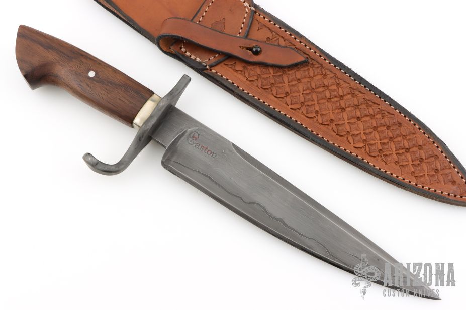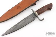 This Fighter by ABS Apprentice Randy Caston features a San Mai Damascus (1084 and 15N20) blade with false top edge, .269" blade stock and 1.751" blade depth, hidden tang construction. The handle has mild steel guard, African Blackwood grip, nickel silver spacer. Comes with a hand tooled brown leather sheath and COA. New from maker. Was featured in the November 2025 issue of Blade Magazine and comes with a photo copy of the pages.