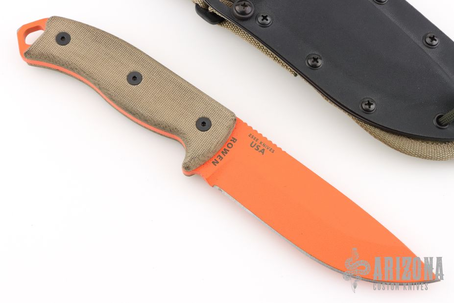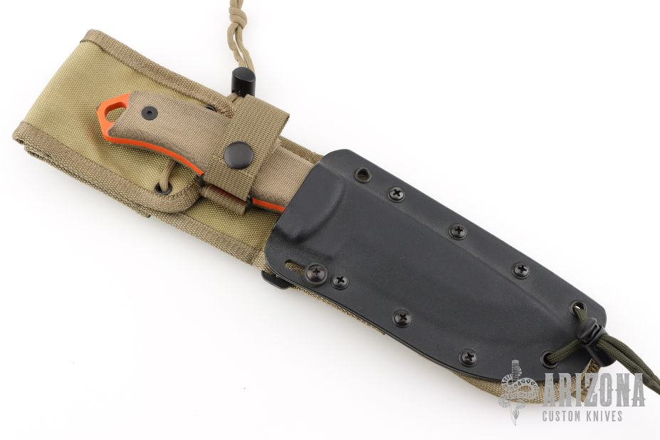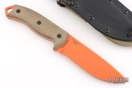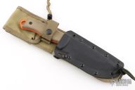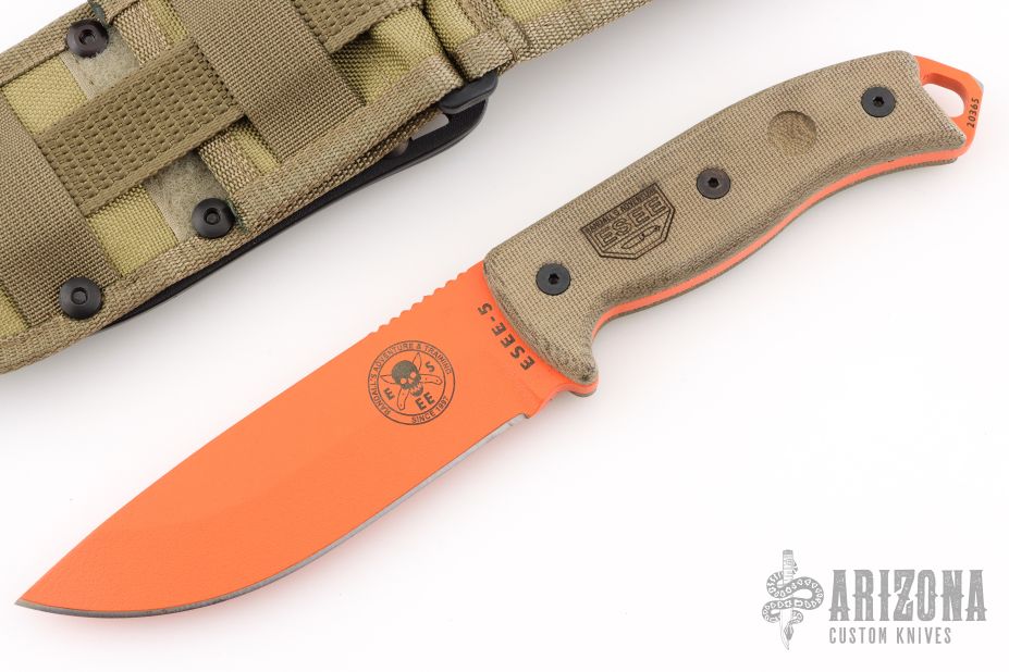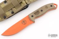 This Esee-5 features an orange coated drop point blade with notched thumbrest, .256" blade stock and 1.609" blade depth. Scales are green canvas micarta. Lanyard bail or skull crusher at but. Comes with black sheath with belt loop mount, and original papers. Excellent condition.