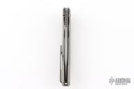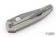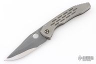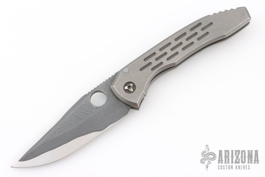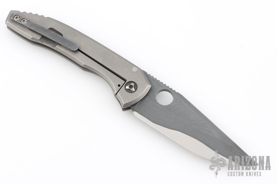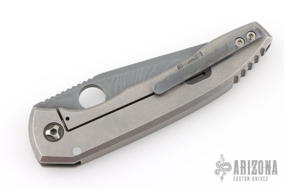 This Nirvana by Peter Rassenti features a Chad Nichols Stelite Core San Mai Damascus blade with a thumbhole and notched thumbrest. The handle has an integral stonewashed titanium frame with a Damascus clip, tip up carry. Nice detent, lockup and blade seating. Comes with zippered case. Excellent condition.