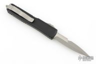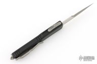 This knife from Microtech was the 2023 Blade Show Special. It has a double edged bayonet ground blade with an Apocalyptic finish. The handle is black frag pattern G-10 and black aluminum with a tip down Apocalyptic stainless clip and glass breaker at the butt. Comes with an original box and papers. Excellent condition. Dated 06/2023