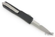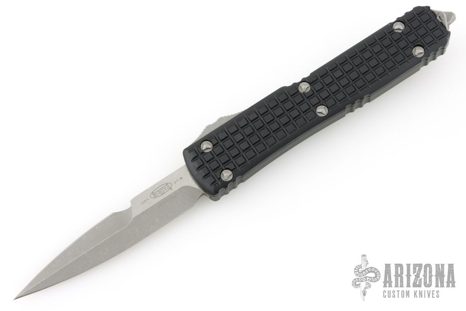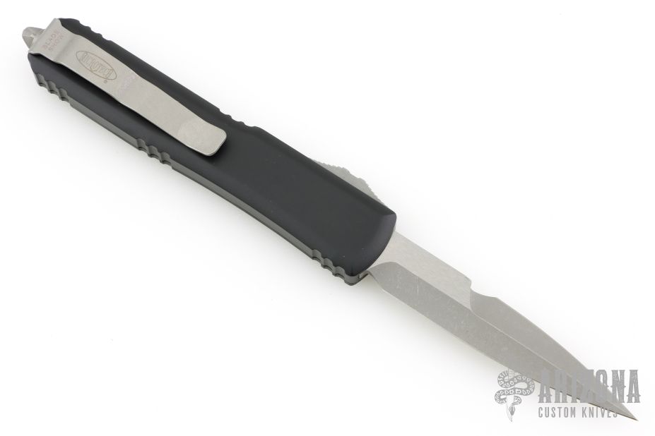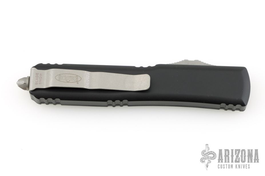 This knife from Microtech was the 2023 Blade Show Special. It has a double edged bayonet ground blade with an Apocalyptic finish. The handle is black frag pattern G-10 and black aluminum with a tip down Apocalyptic stainless clip and glass breaker at the butt. Comes with an original box and papers. Excellent condition. Dated 06/2023