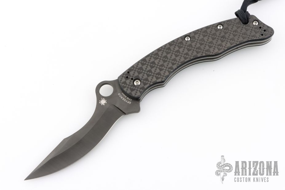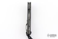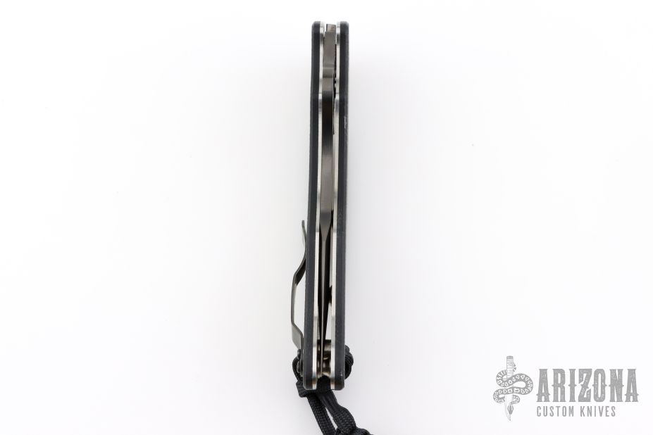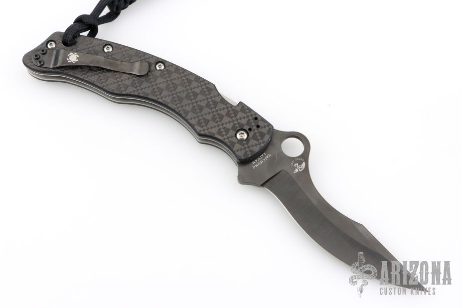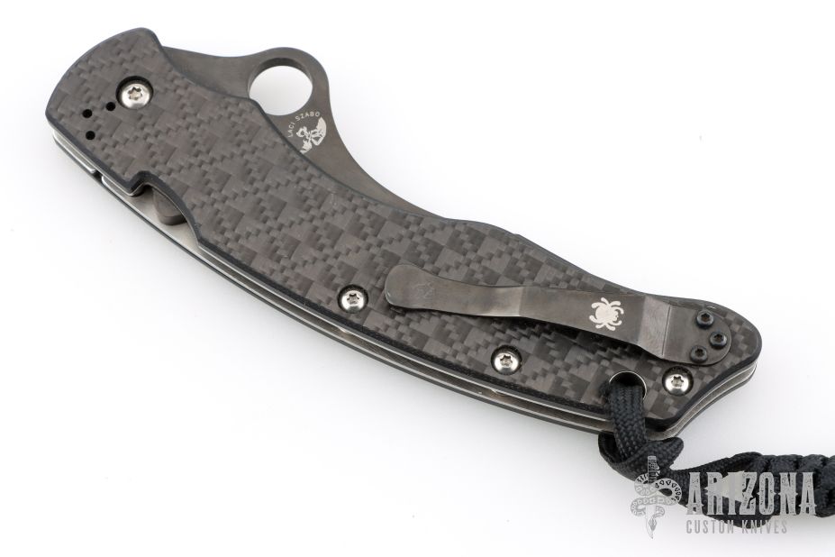 This Laci Szabo folder has a black scimitar shaped blade maximizes cutting power yet has a well centered blade to support point-oriented tactics. The large size is intimidating. The handle scales are a striking G10 that simulates carbon fiber. Unusual top facing liner lock. Has a couple light scratches, otherwise excellent condition.