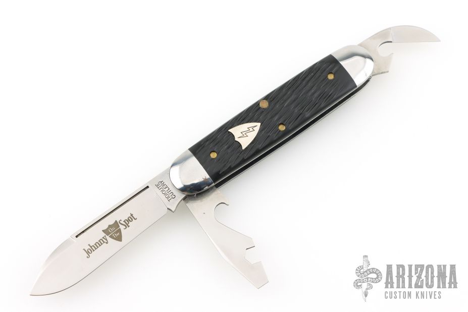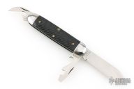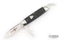 This slipjoint from Great Eastern Cutlery features satin finished blades with nail nicks. The handle has nickel silver bolsters and jigged black Tex Delrin covers with nickel silver escutcheon, steel liners and steel backsprings. Includes original packaging. Excellent Condition.